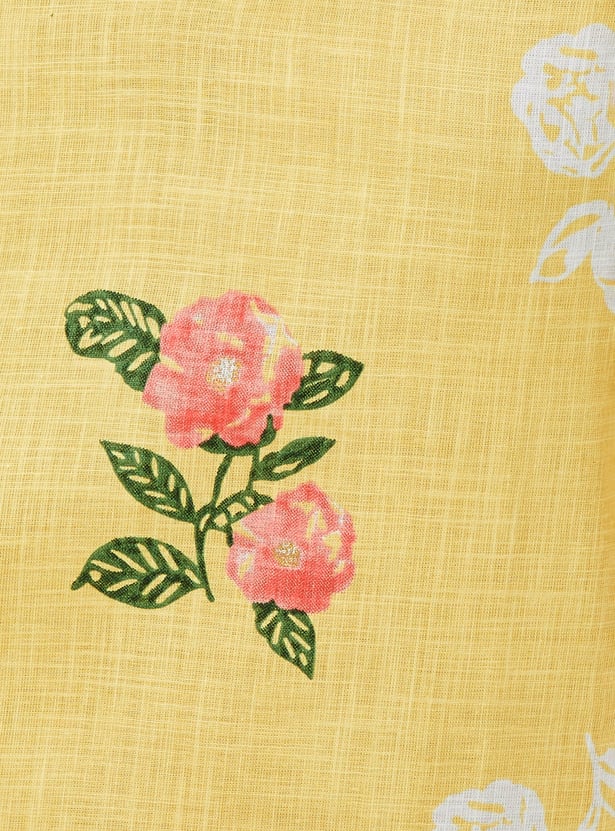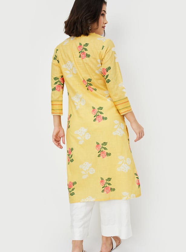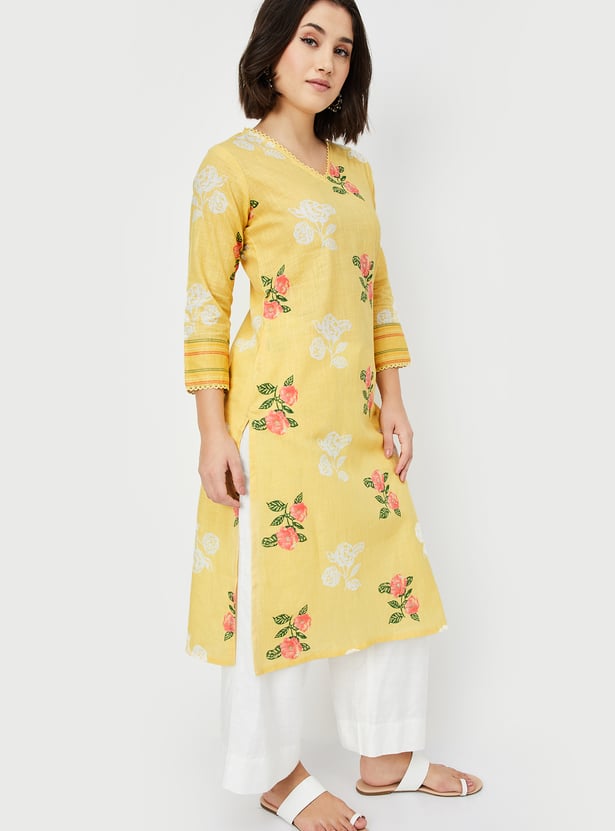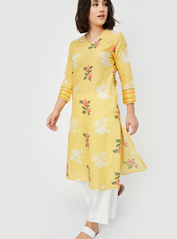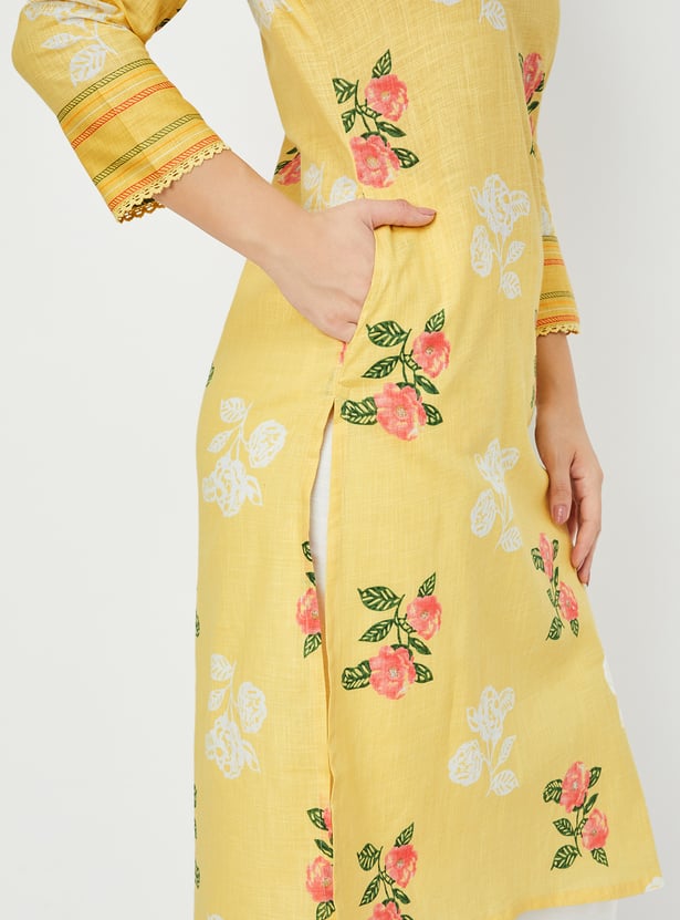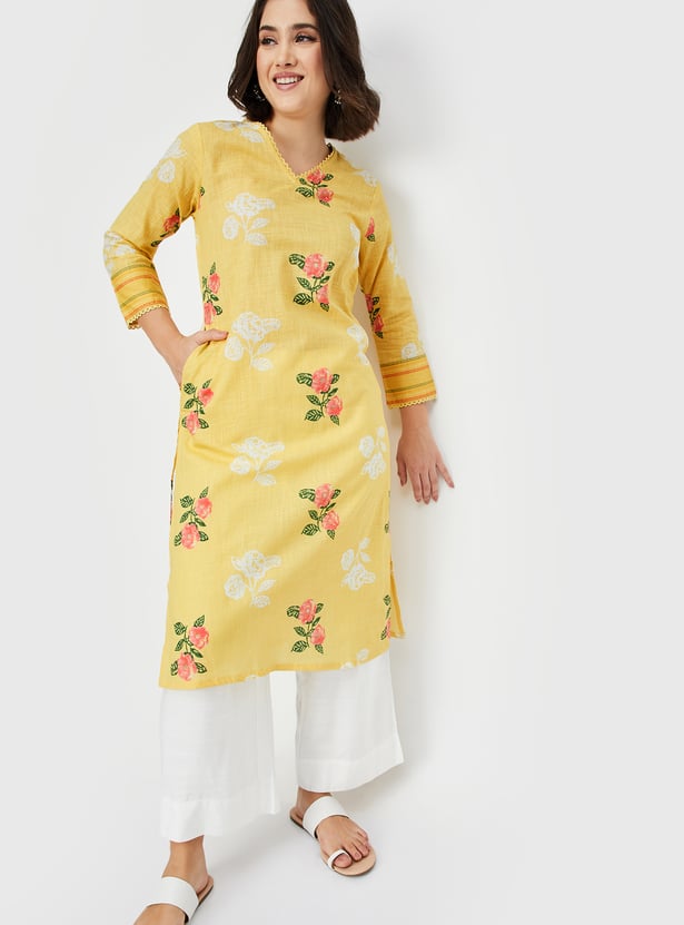 Paint a picture of elegance in this straight kurta. The floral prints add a sophisticated touch, while the waist pocket offers convenience. It features a V-neck and three-quarter sleeve with lace trim for added allure.