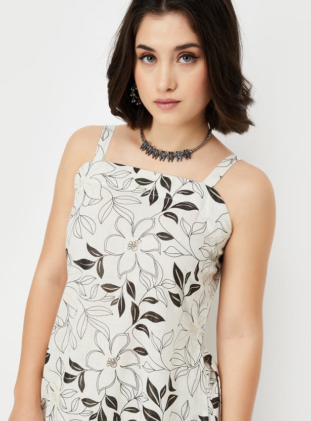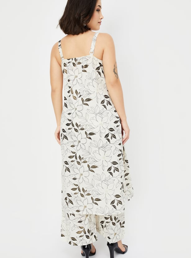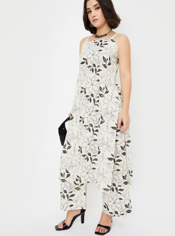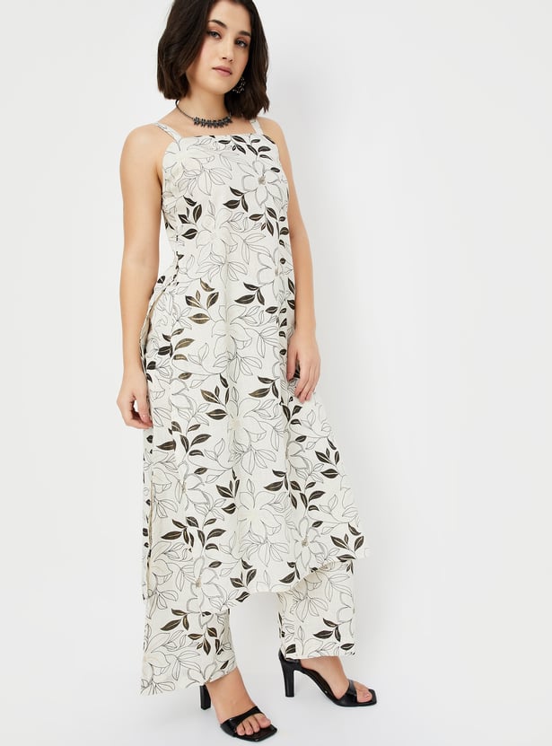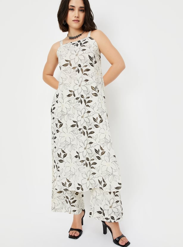 Embrace timeless charm with this floral printed straight kurta set. Featuring a square neck kurta with straps , and side slits, it combines style and practicality effortlessly. The set includes palazzo pants with an elasticated waist for a complete look.