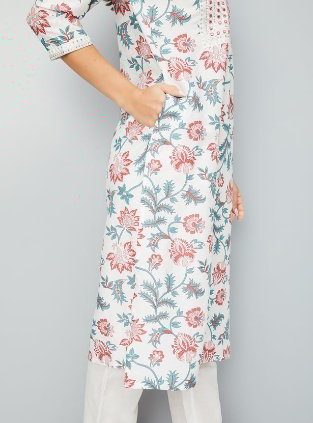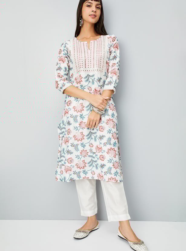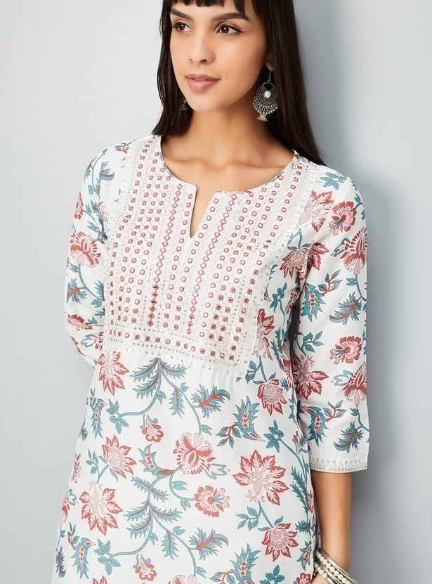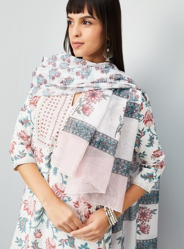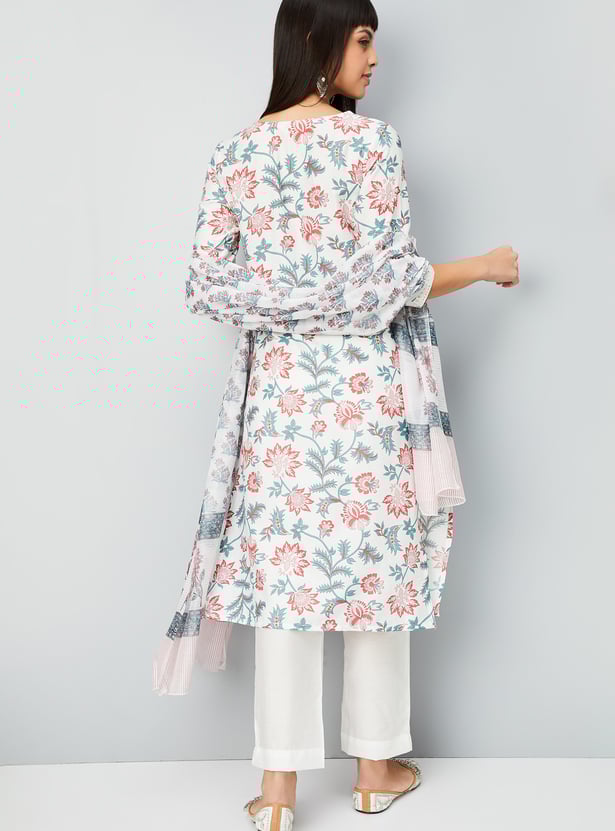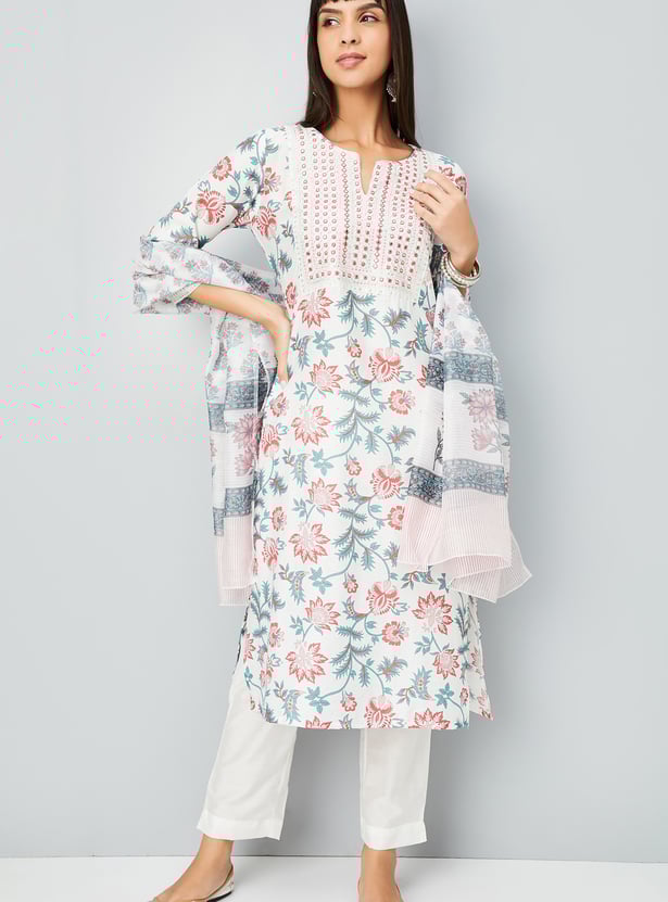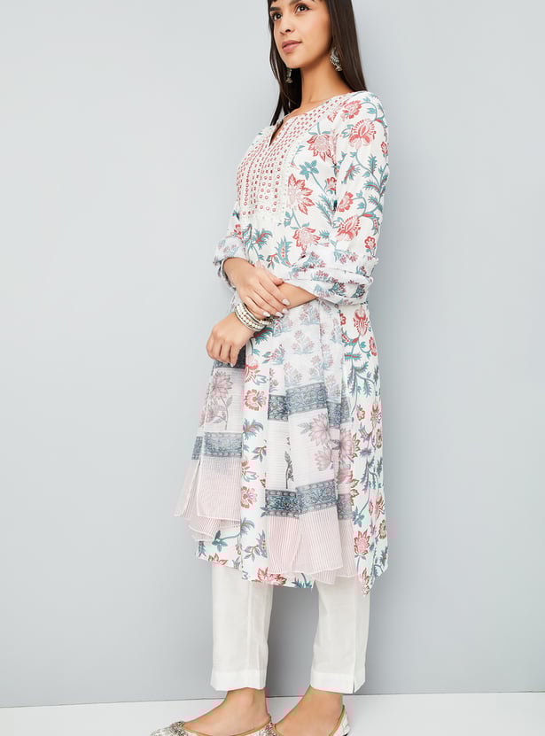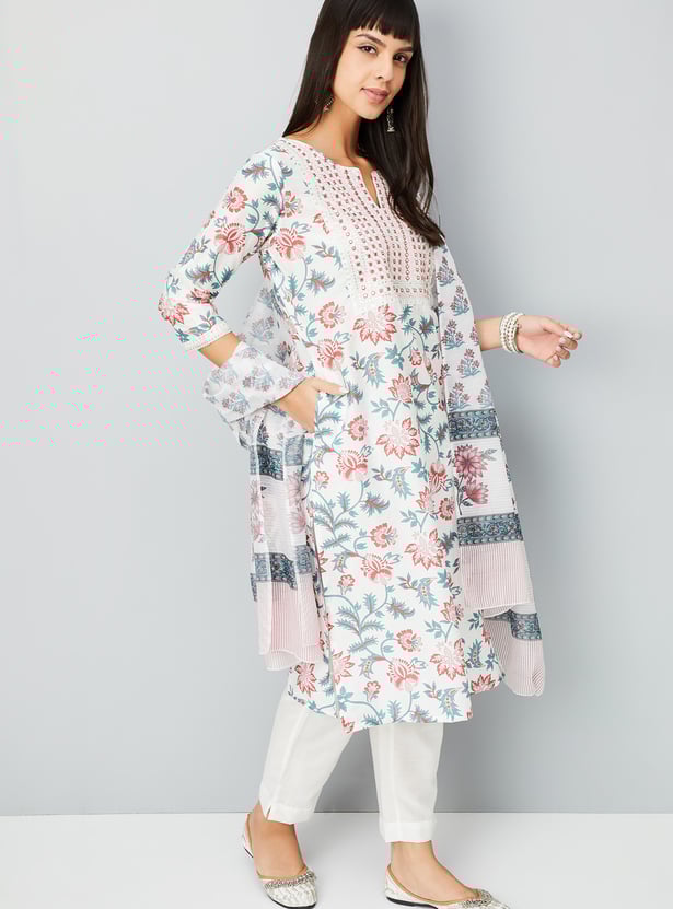 Celebrate effortless ethnic elegance with this floral print straight kurta set. The kurta features a graceful notch neck, 3/4th sleeves, and side slits, perfectly paired with elasticated waist straight pants and a matching dupatta for a complete look.