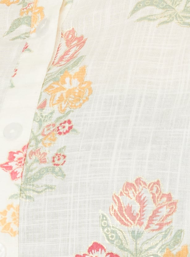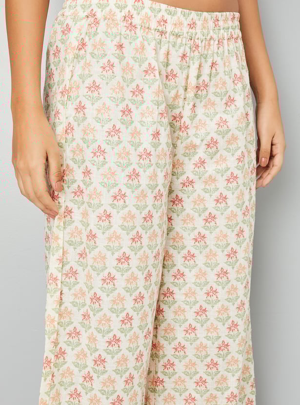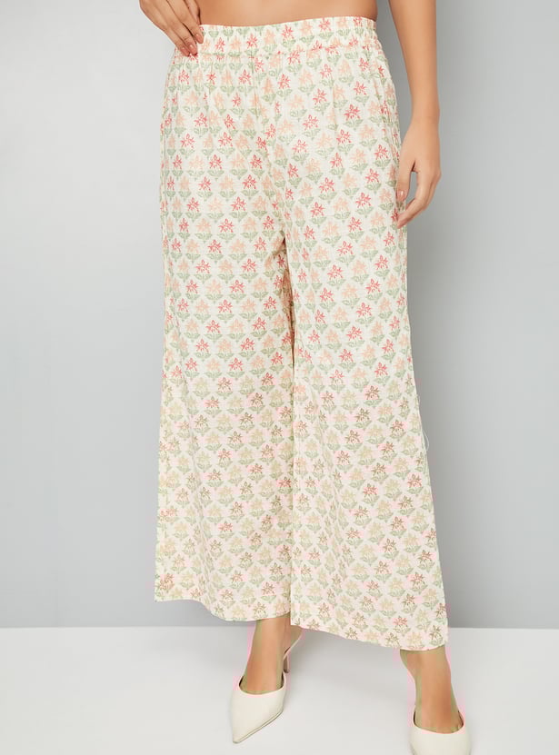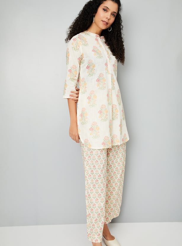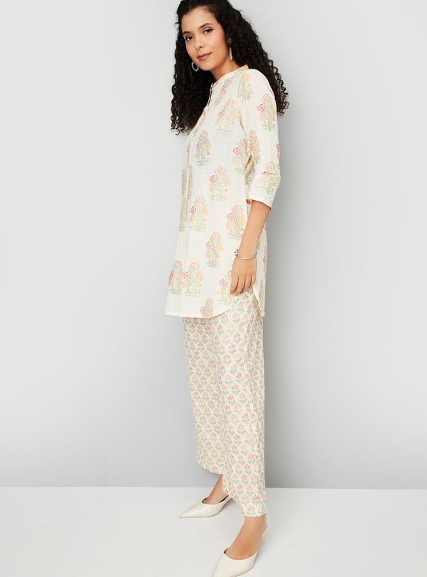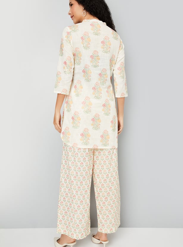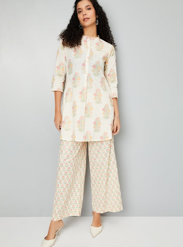 Embrace effortless elegance with this floral print A-line kurta set. The kurti boasts a band collar, button placket, 3/4th sleeves, offering a flattering silhouette. Paired with elasticated waist palazzo pants, this set ensures both comfort and style for any occasion.