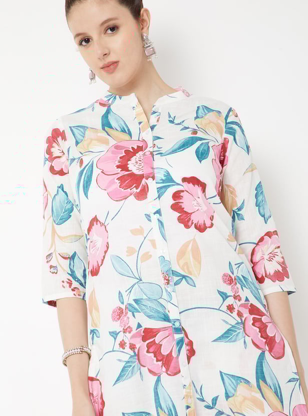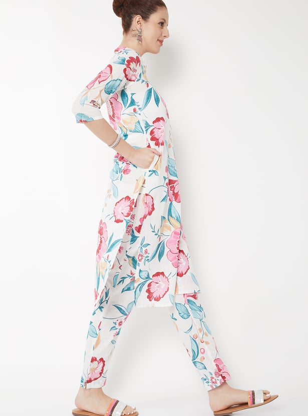 Step into effortless elegance with this floral print straight kurta set, featuring a band collar, three‑quarter sleeves, and side slits for easy movement. Designed with handy pockets and paired with straight pants with an elasticated waist, it blends comfort with chic appeal—perfect for everyday wear or casual gatherings.