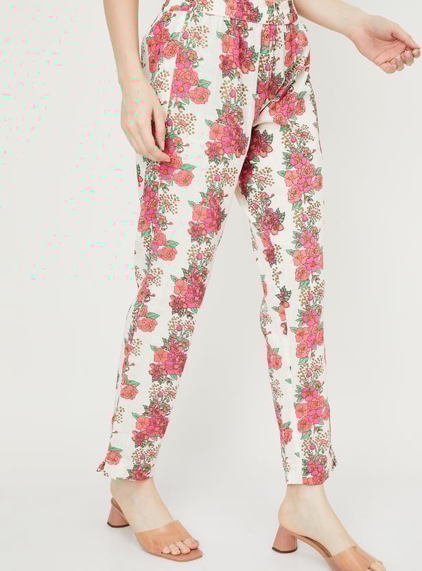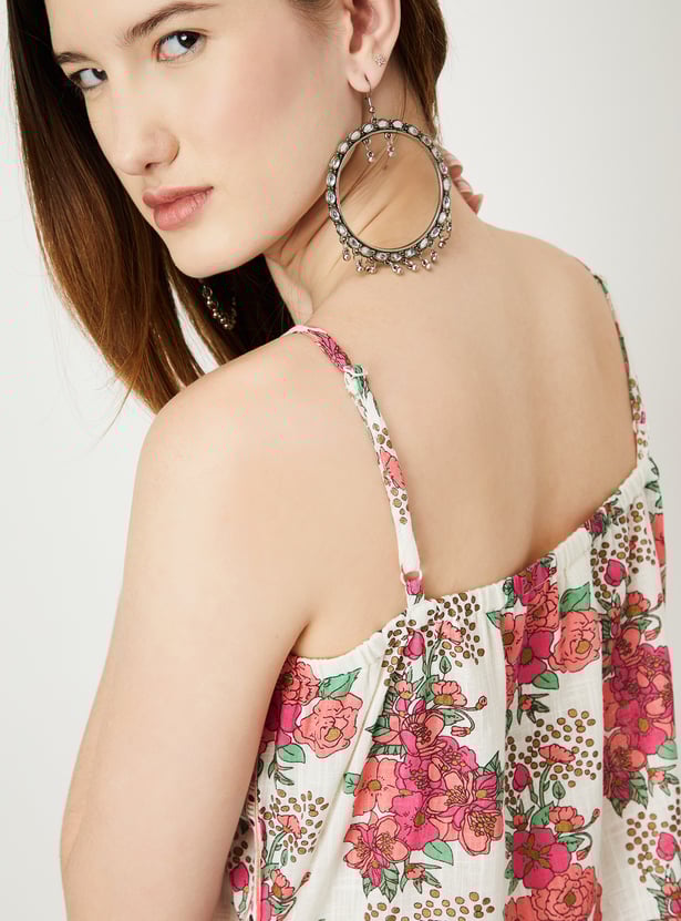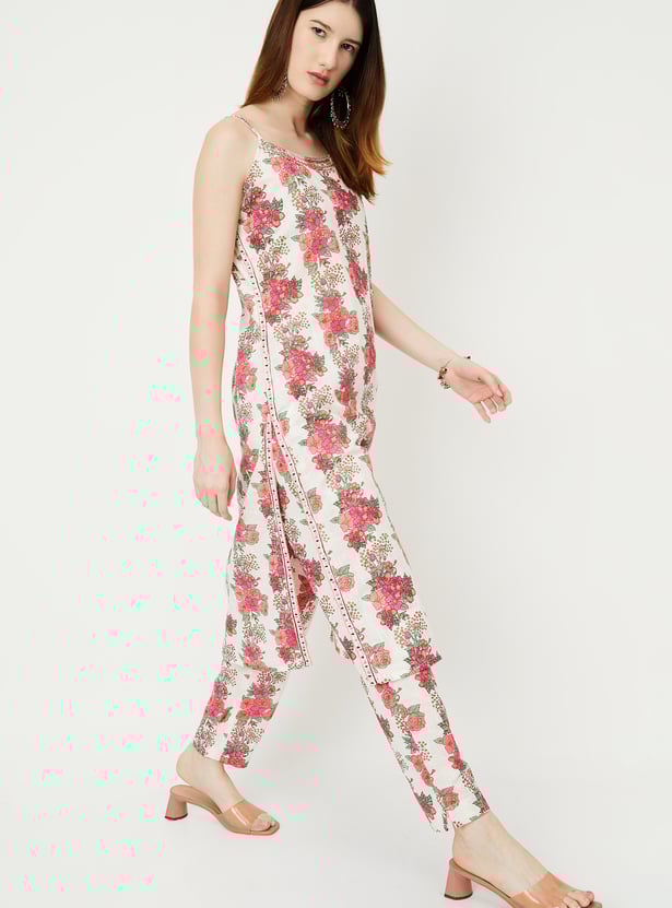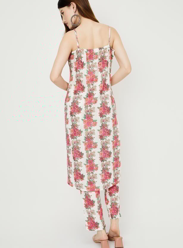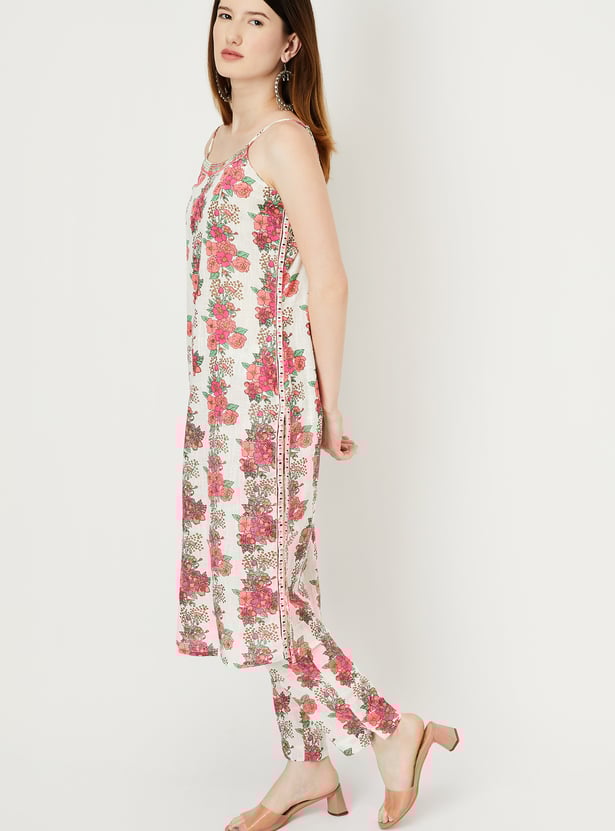 Flaunt your style with this floral-printed kurta set that exudes elegance. It features a round neck with spaghetti straps for added charm. Paired with matching straight pants featuring an elasticated waistband, this ensemble is perfect for combining style and comfort.