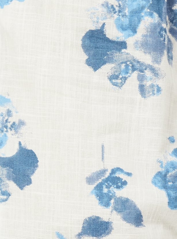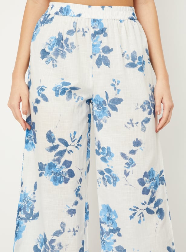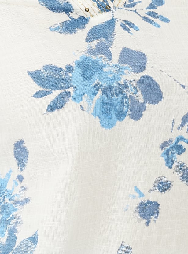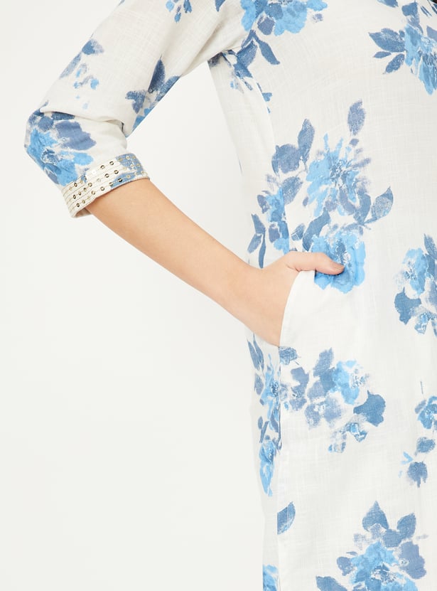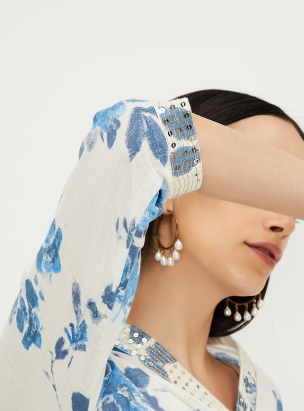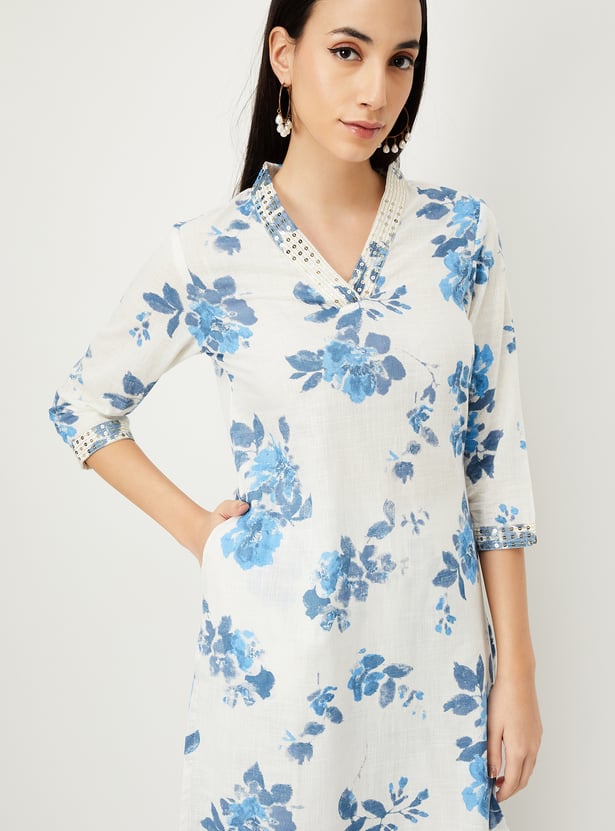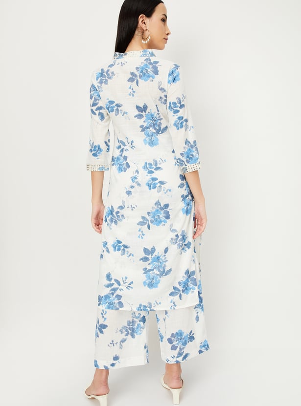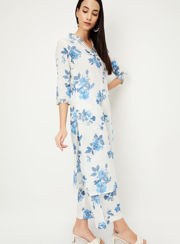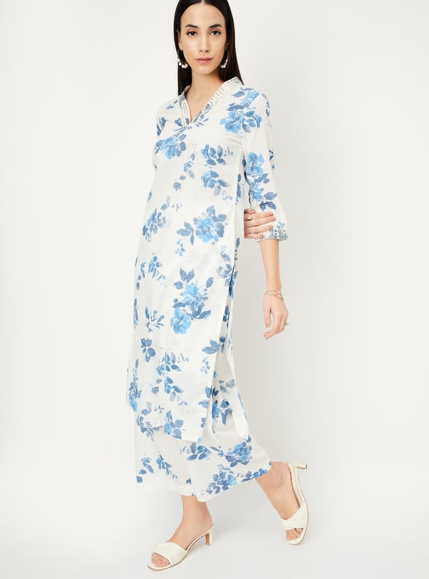 Radiate elegance in this timeless kurta set. An epitome of grace and elegance, this set features a kurta with intricate floral prints, an embellished v-neck, and three-quarter sleeves. It is paired with elasticated palazzos, making it perfect for daily wear.