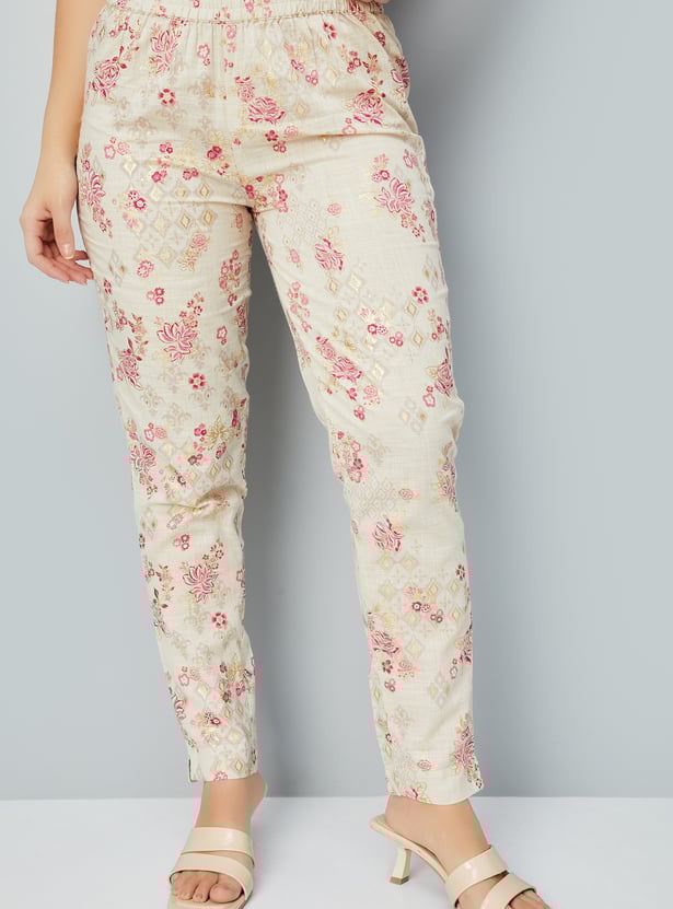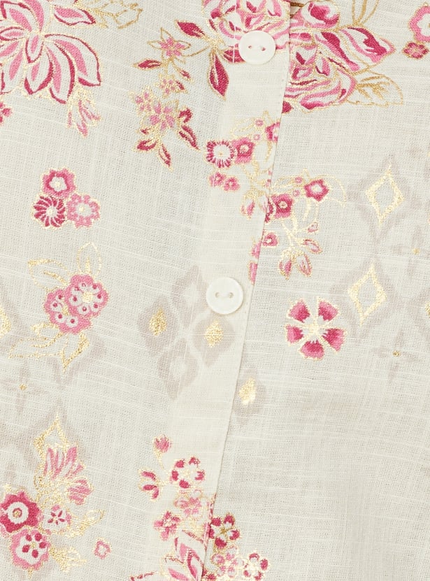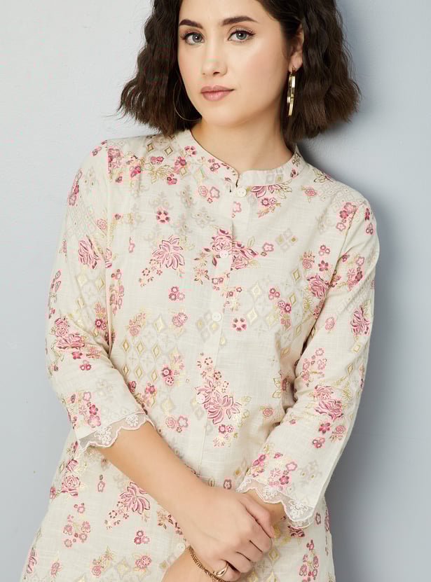 Flaunt elegance in this kurta set featuring a vibrant floral print, a band collar, three-quarter sleeves, and a knee-length silhouette. The set includes comfortable straight pants with an elasticated waistband, blending traditional charm with modern style.