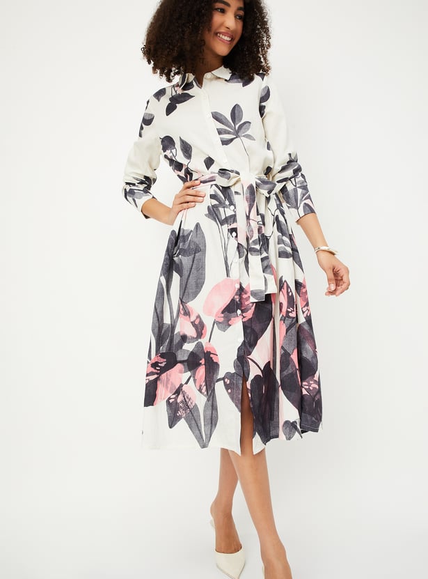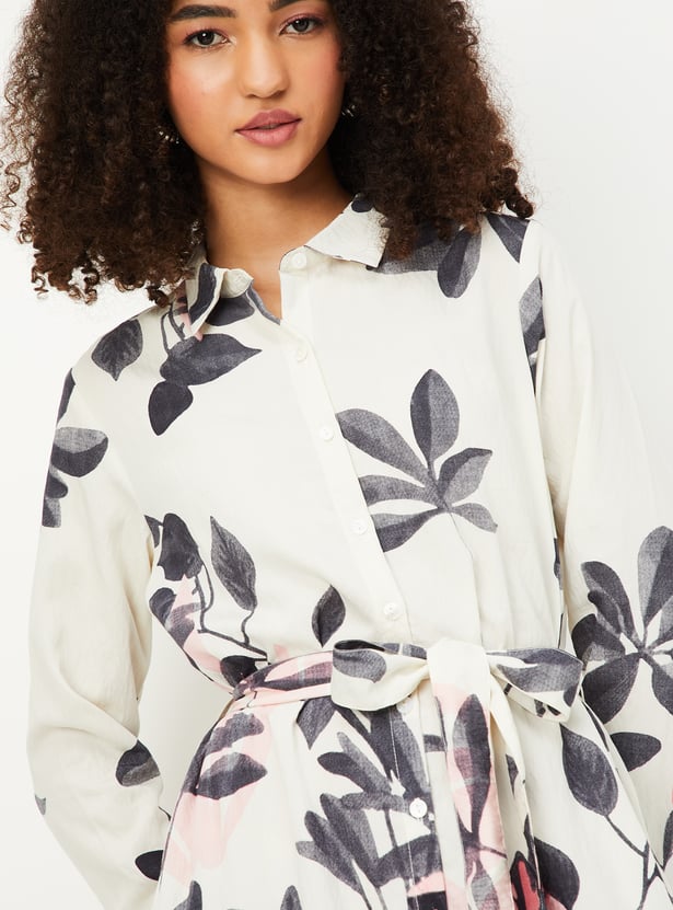 Step into effortless elegance with this floral print shirt dress. Featuring a button placket, spread collar, and a flattering belted waist, it combines a classic silhouette with a touch of feminine charm. The full sleeves add a versatile and comfortable detail, making it perfect for any occasion.