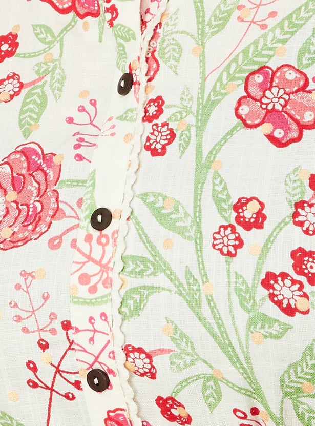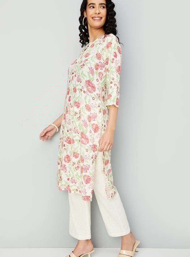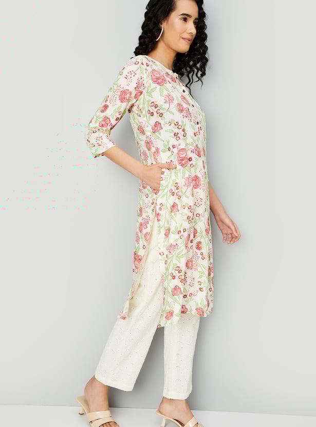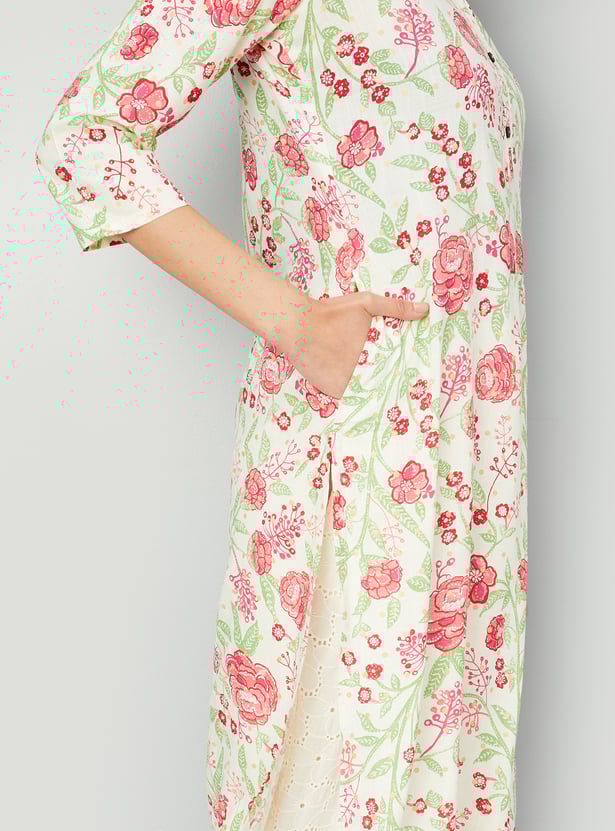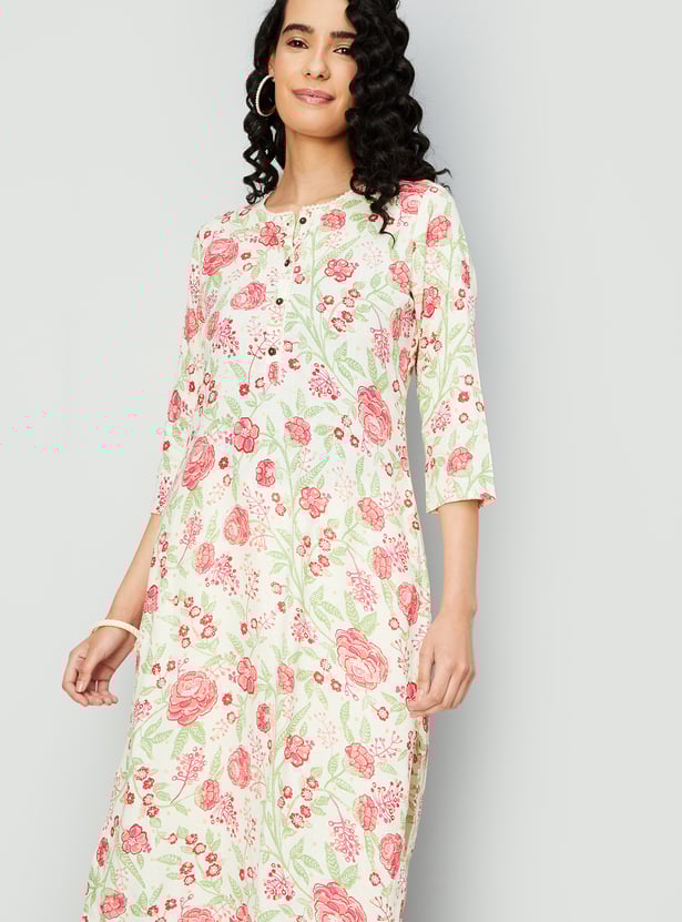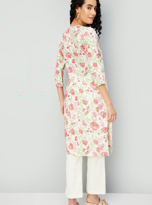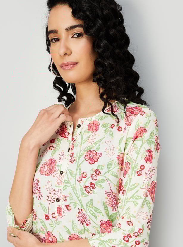 Elevate your style effortlessly with this chic and graceful kurta adorned with a floral print. Featuring a round neck with lace, three-quarter sleeves, and calf-length construction, it exudes simplicity and elegance.