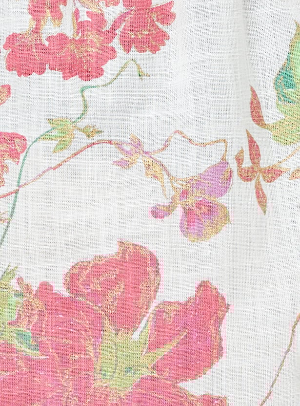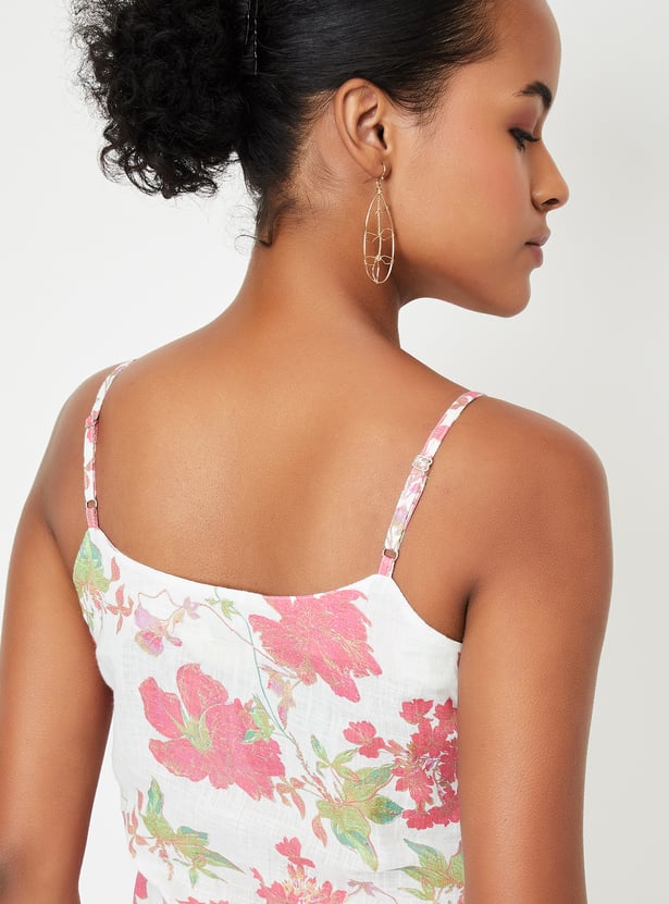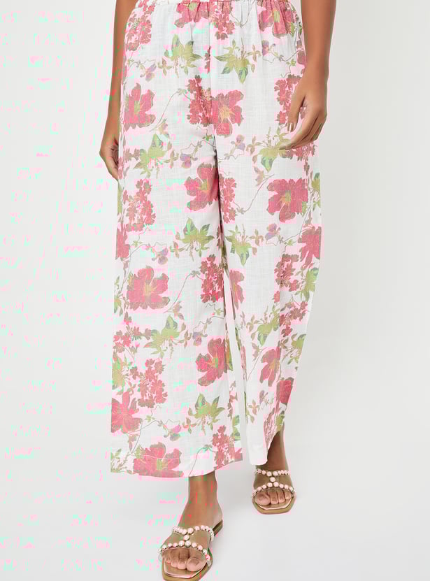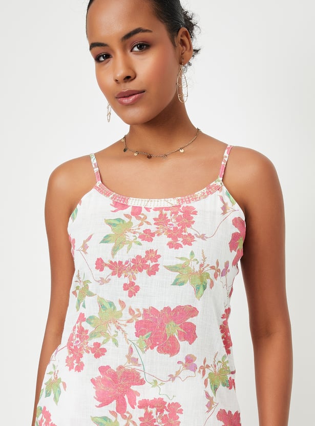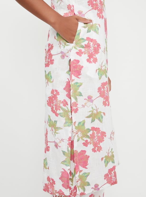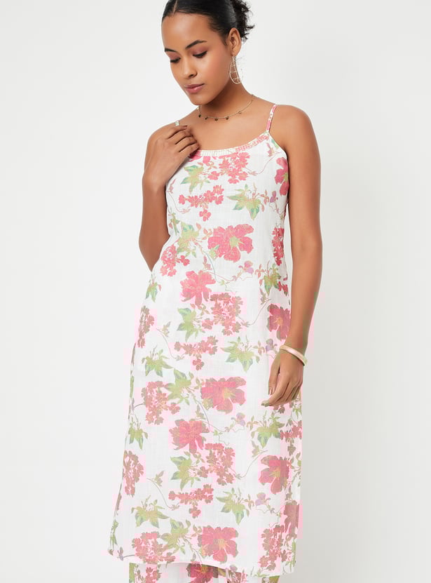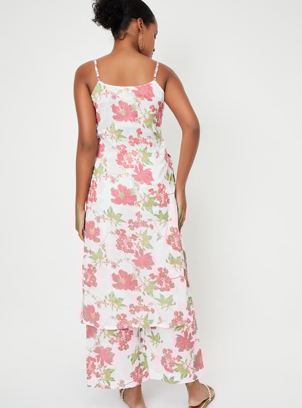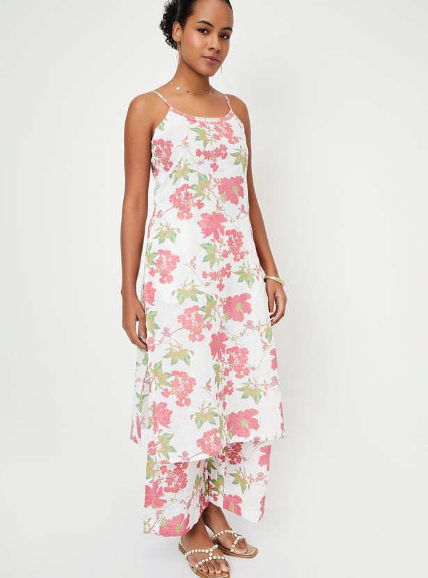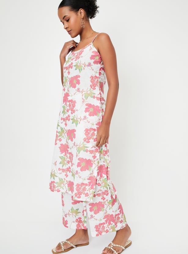 Showcase your style with this floral-printed kurta set that radiates elegance. It boasts a round neck with charming spaghetti straps and a pocket. The set includes matching palazzos with an elasticated waistband, seamlessly blending style and comfort.