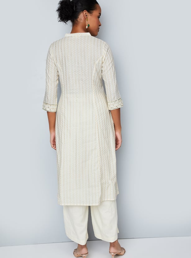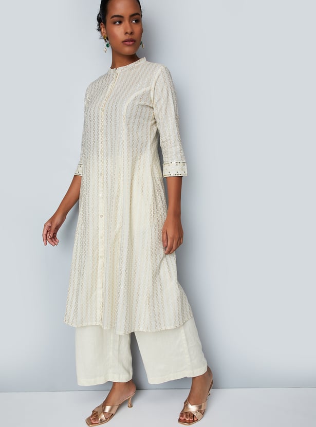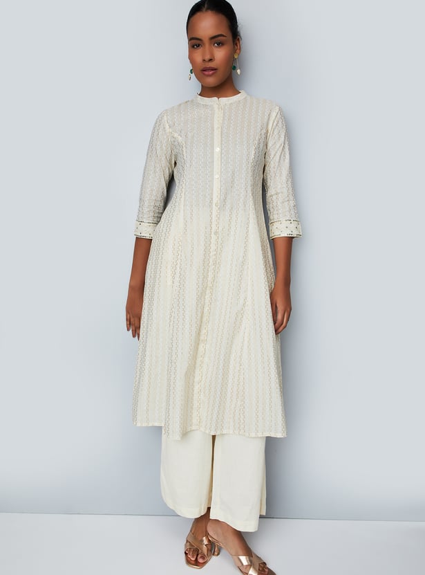 Flaunt an elegant ethnic look with this Kalidar kurta. Its foil-printed design, complemented by a band collar with a button placket and three-quarter sleeves, and a calf-length silhouette exudes timeless charm.