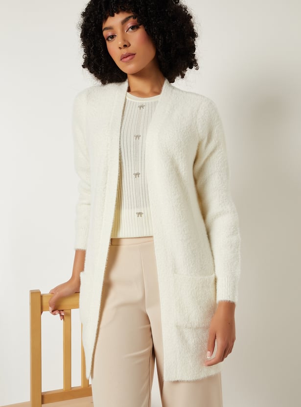 Stay cozy and casual with this knit cardigan featuring an open front, full sleeves, and handy patch pockets. A versatile layering piece perfect for everyday comfort and style. Model Size :