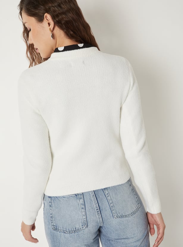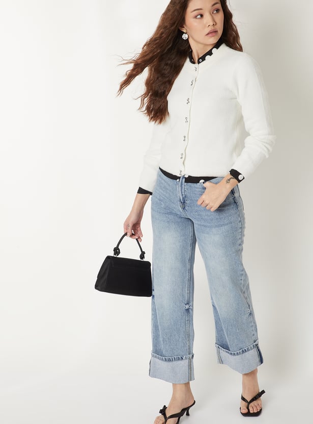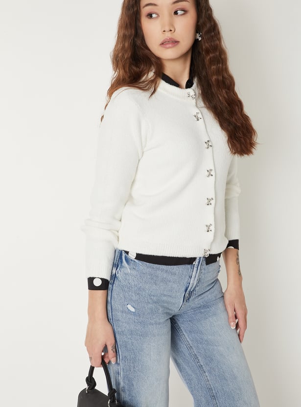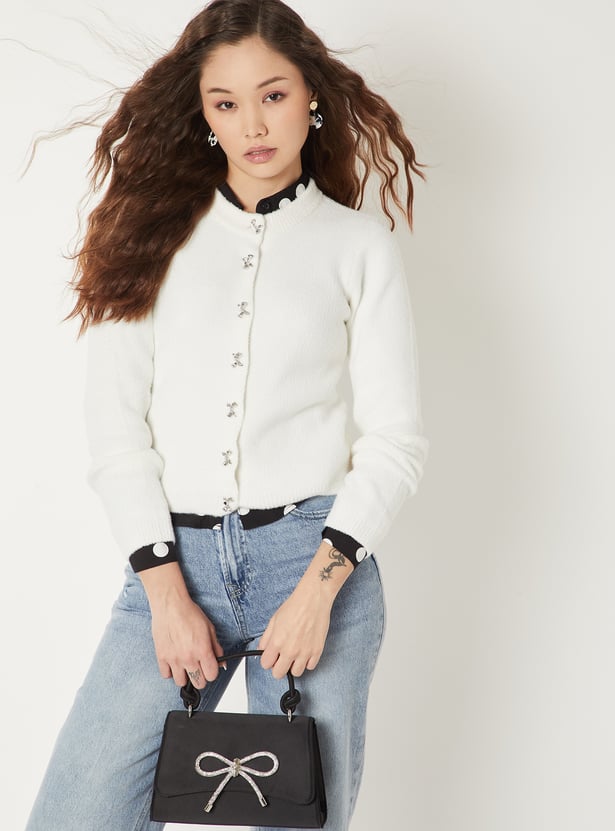 This solid knit sweater blends a classic round neck and full sleeves with a chic button-down front finished in charming bow-style buttons. Its soft knit and refined detailing make it an effortless pick for cosy, stylish dressing.