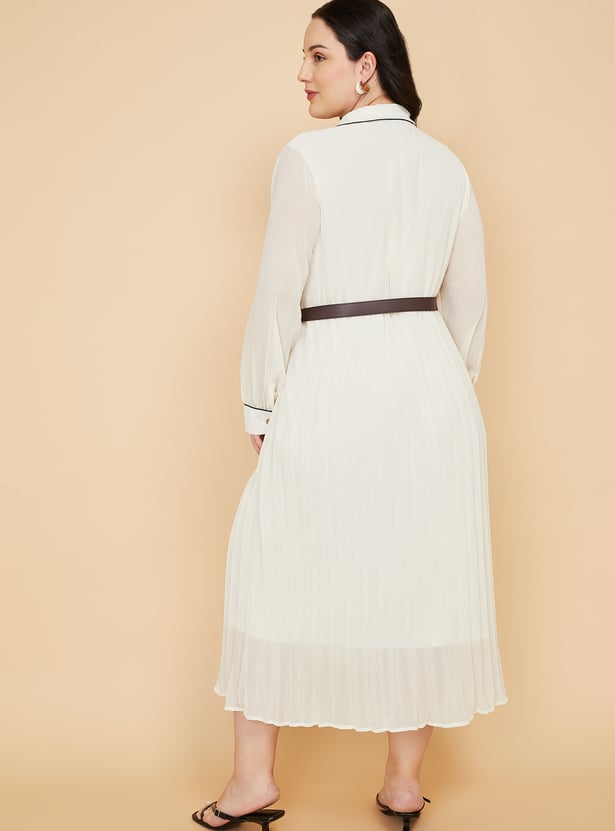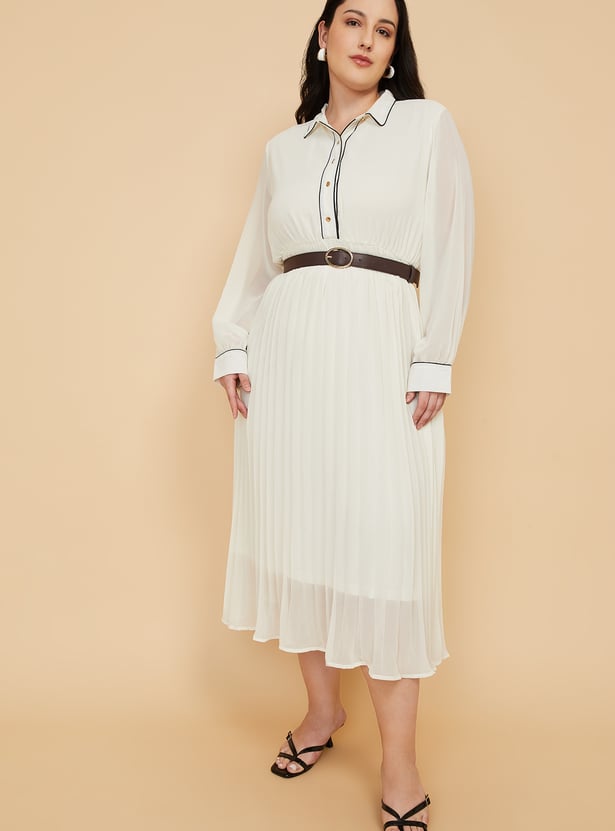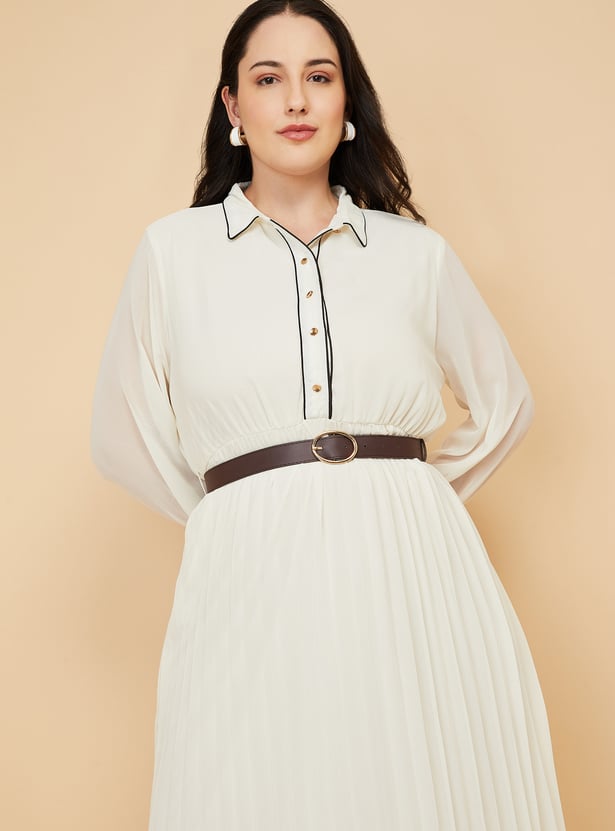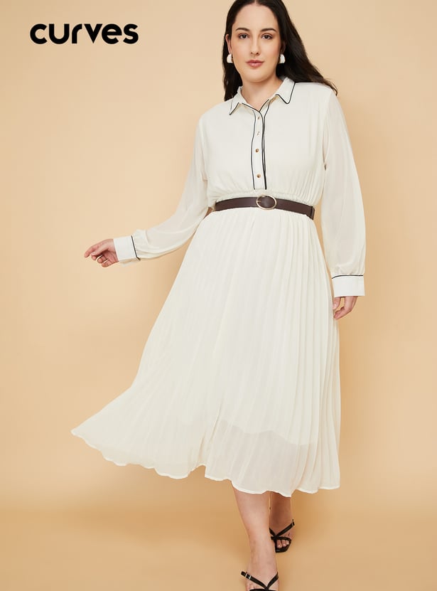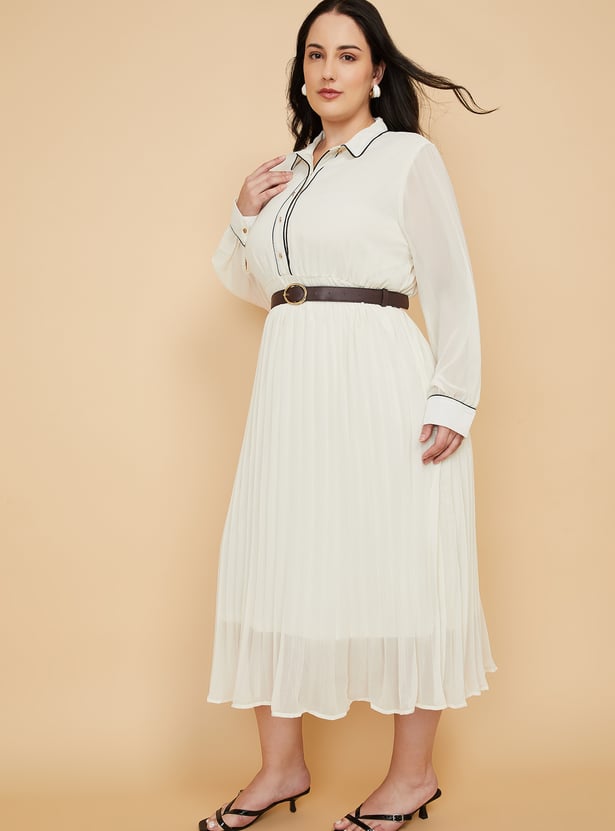 Elevate your wardrobe with this chic pleated A-Line dress, blending classic tailoring with modern detailing. Designed with a spread collar and full sleeves finished with cuffs, this dress features contrast piping for a refined touch. The half-button placket adds subtle structure, while the pleated silhouette ensures effortless movement and style.