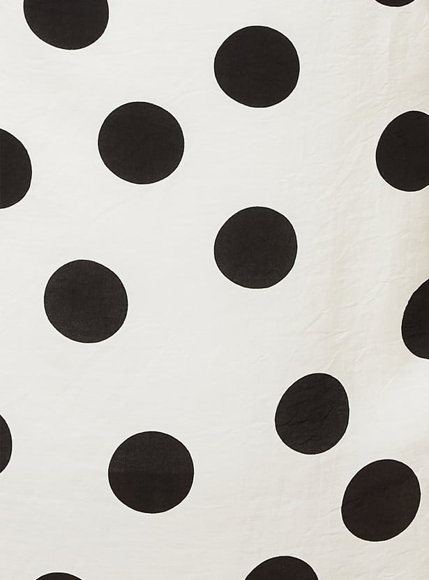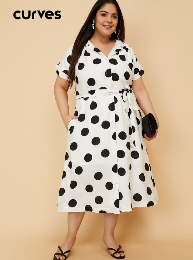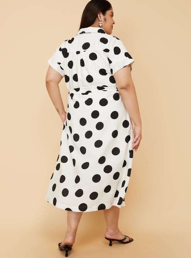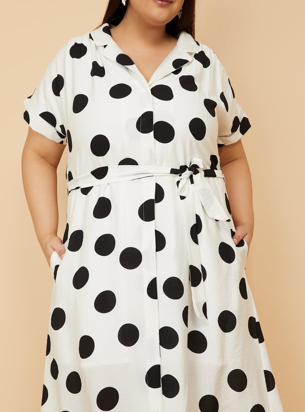 A chic polka dots shirt dress featuring a belted waist, half sleeves with cuffed button details, and a structured button-down yoke for a polished silhouette. Subtle print and a collared neckline add a modern touch.Model Size :
