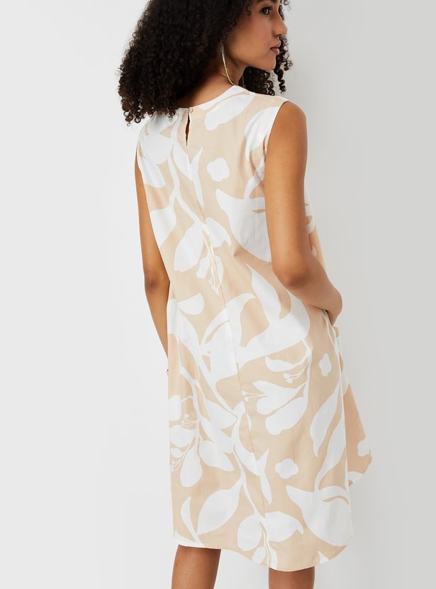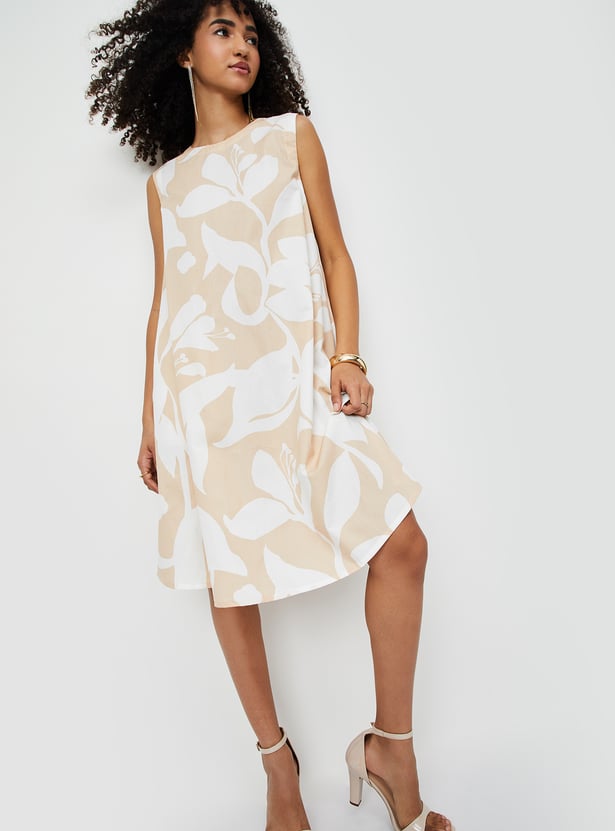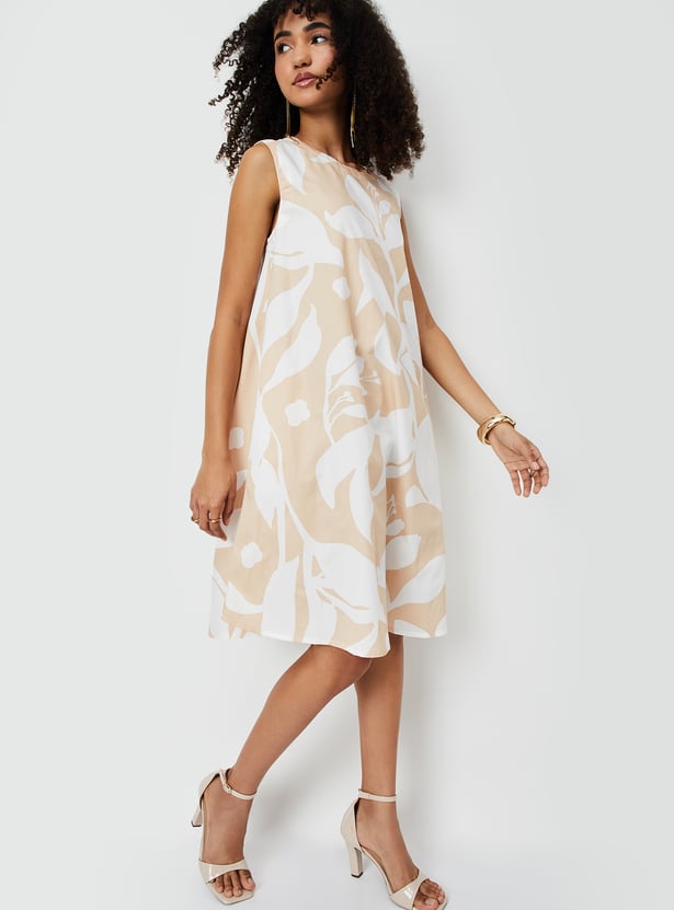 Stay effortlessly chic in this printed A-line dress, featuring a classic round neck, sleeveless design, button closure, and a flattering knee-length silhouette. The playful print adds a fun touch to this versatile piece.