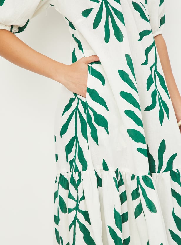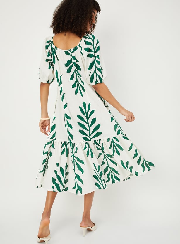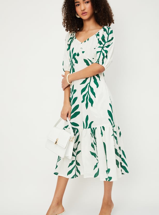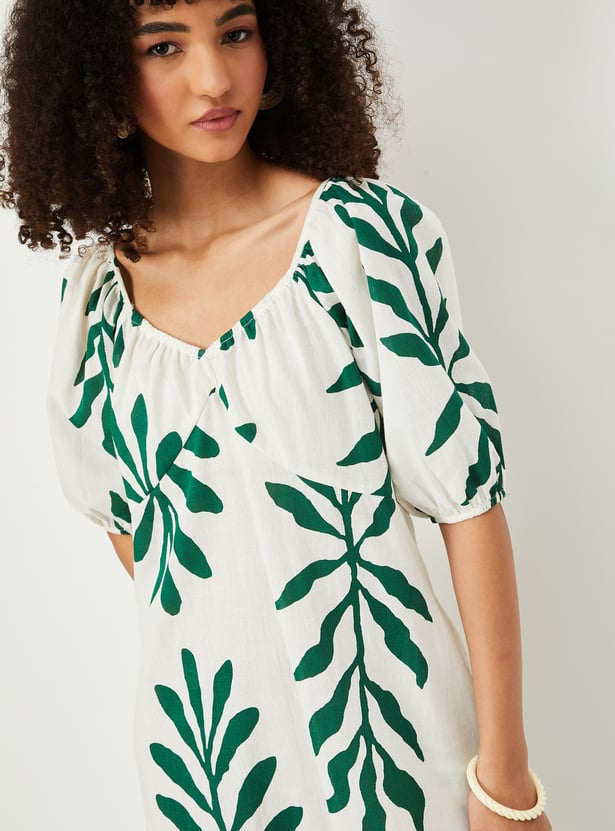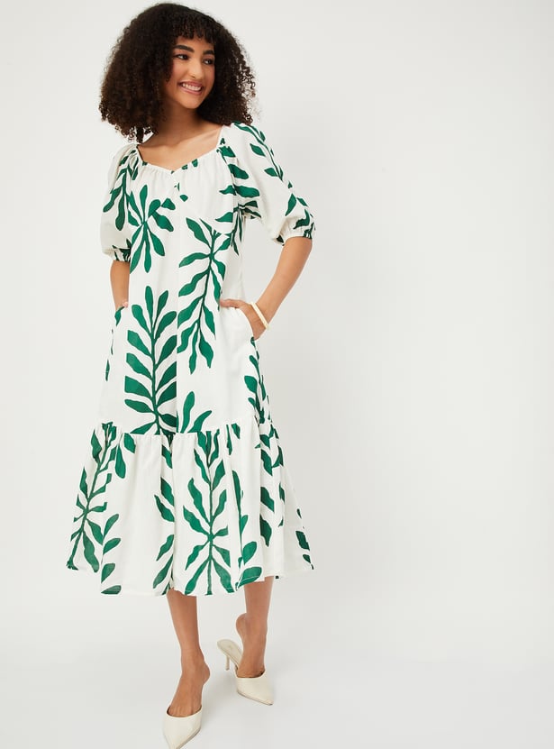 Romantic and playful, this printed midi dress features a sweetheart neckline, puff sleeves, and a side pocket for a touch of practicality. The midi length offers an effortlessly elegant silhouette.