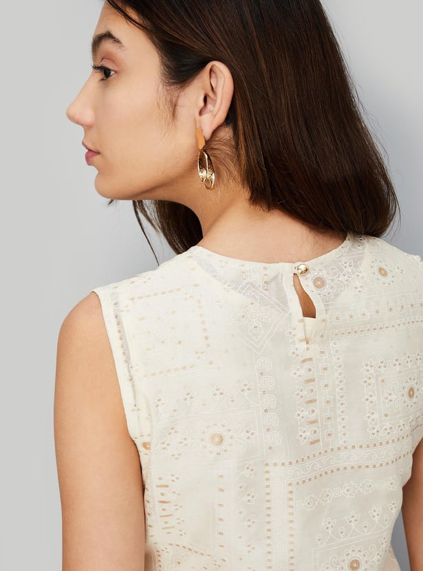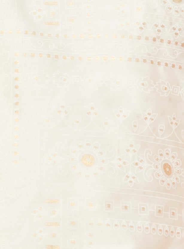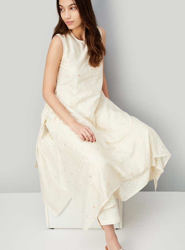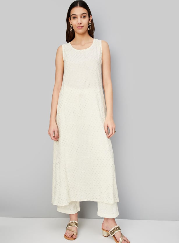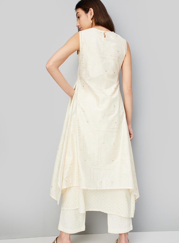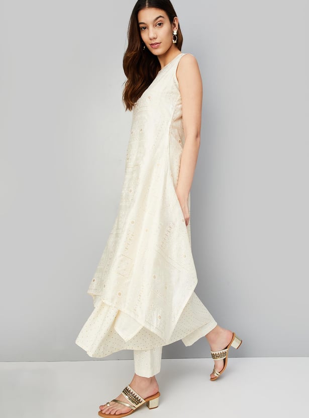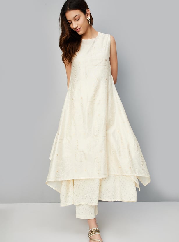 Glam up for special occasions in this printed layered kurta. It has a printed inner layer kurta in an A-line profile with a round neck and sleeveless construction. The outer kurta has a round neck, a sleeveless profile and a handkerchief hem.