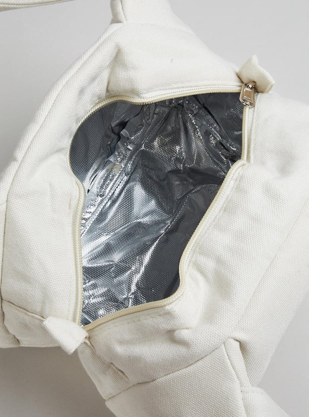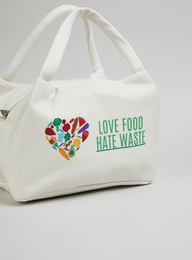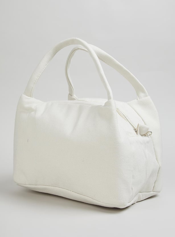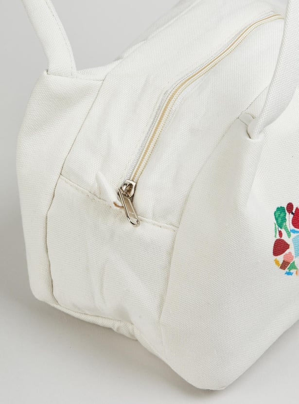 Carry your lunch to the office or picnic in this bag. It has a top handle, cute prints at the front, and a zip top with a spacious main compartment.