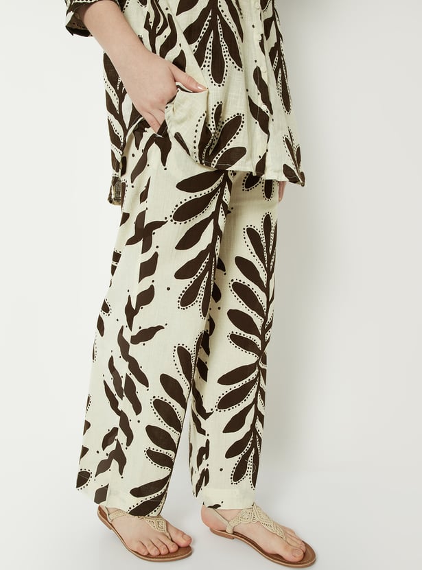 Bring a breezy vibe to your look with these printed palazzos. Adorned with bold leaf prints, they feature a drawstring waist for a comfortable fit. Side pockets add everyday practicality to the wide-leg silhouette.