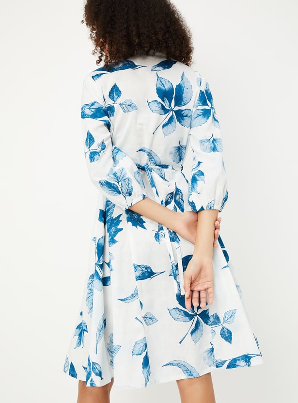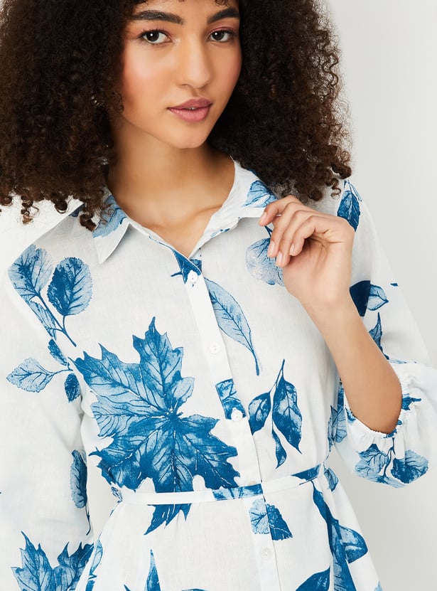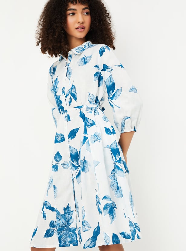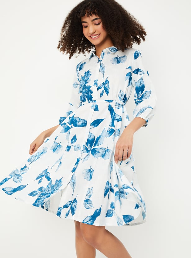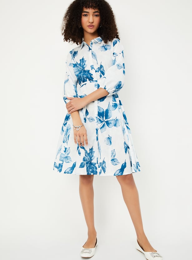 A fresh twist on a classic. This knee-length shirt dress features a spread collar, 3/4th sleeves, and a button placket, finished with an all-over print that adds personality to its timeless silhouette.