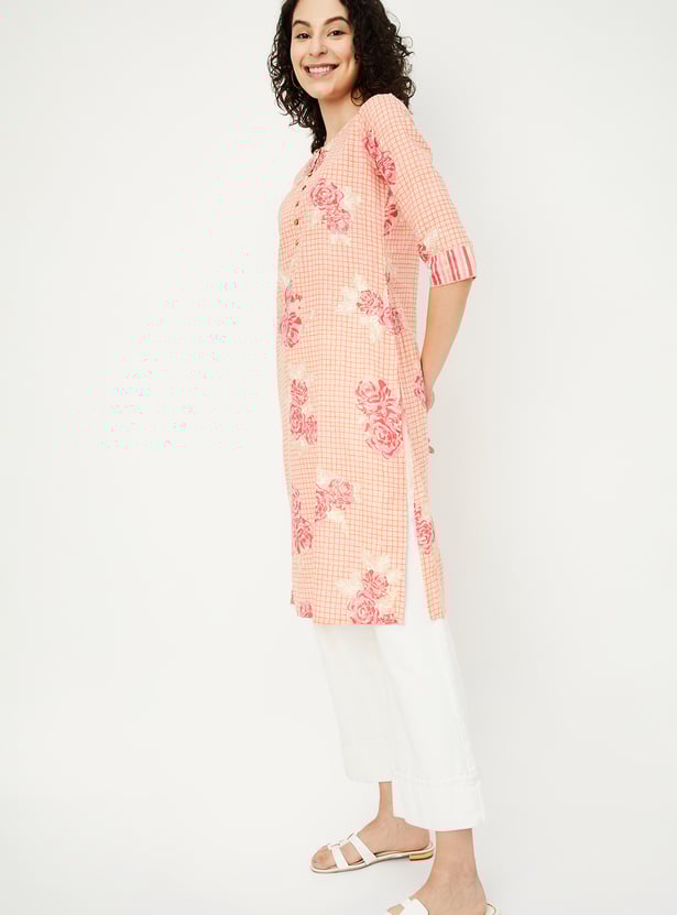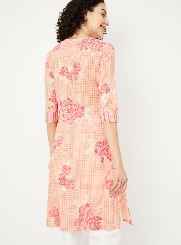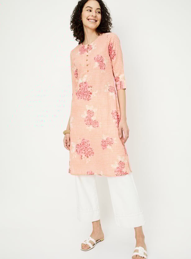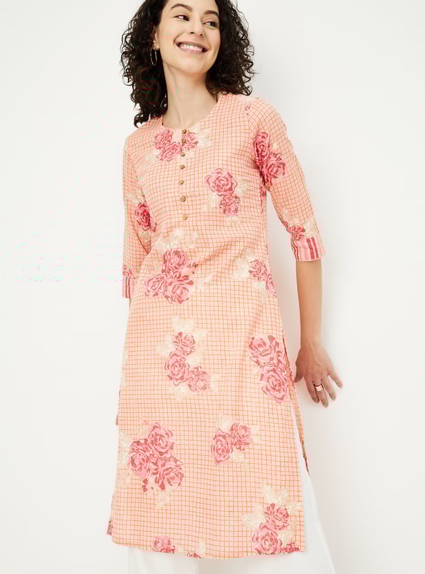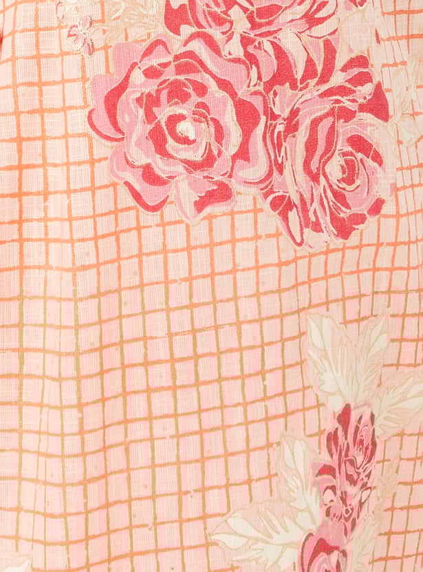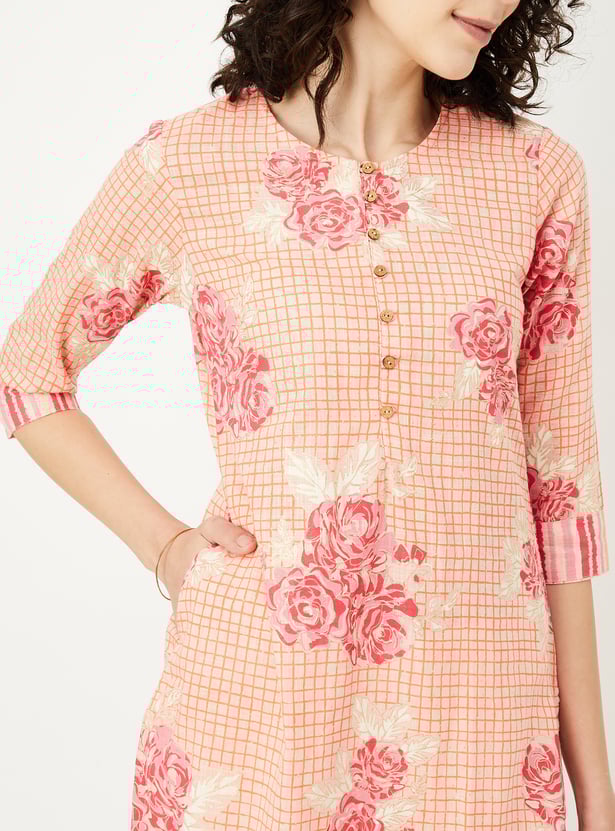 This kurta features an all-over print with a round neck and three-quarter sleeves, offering a stylish and modern look. It includes a convenient side pocket, adding functionality to the design. The versatile style makes it perfect for everyday wear. Comfortable yet fashionable, it's a must-have addition to your wardrobe.