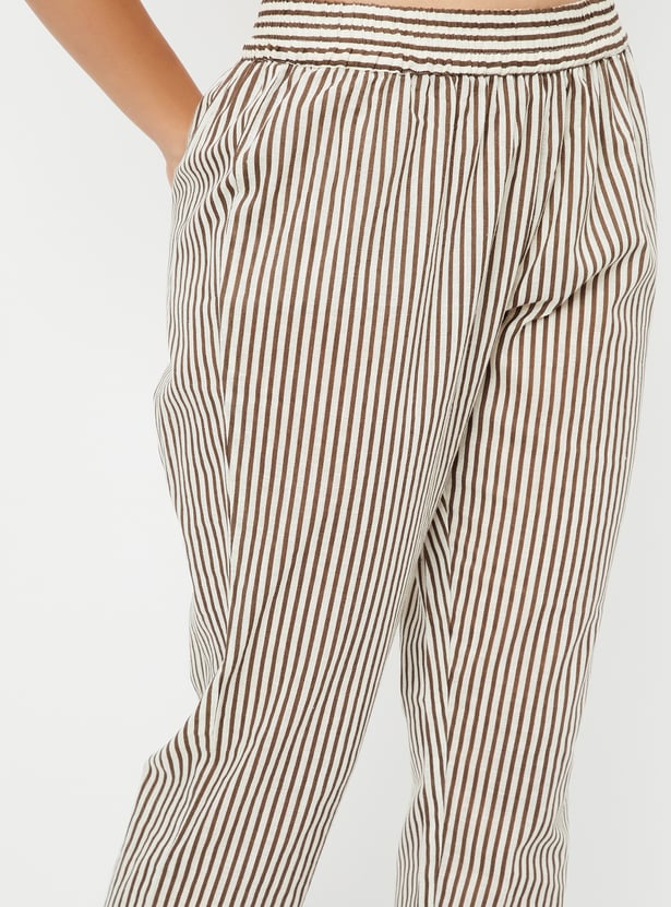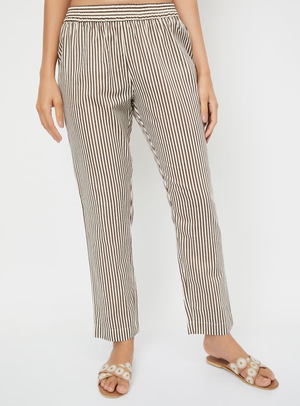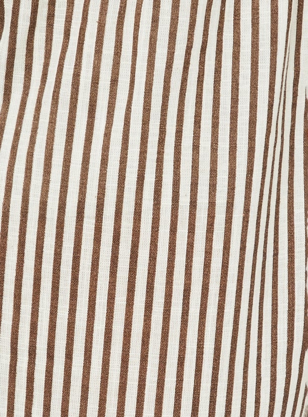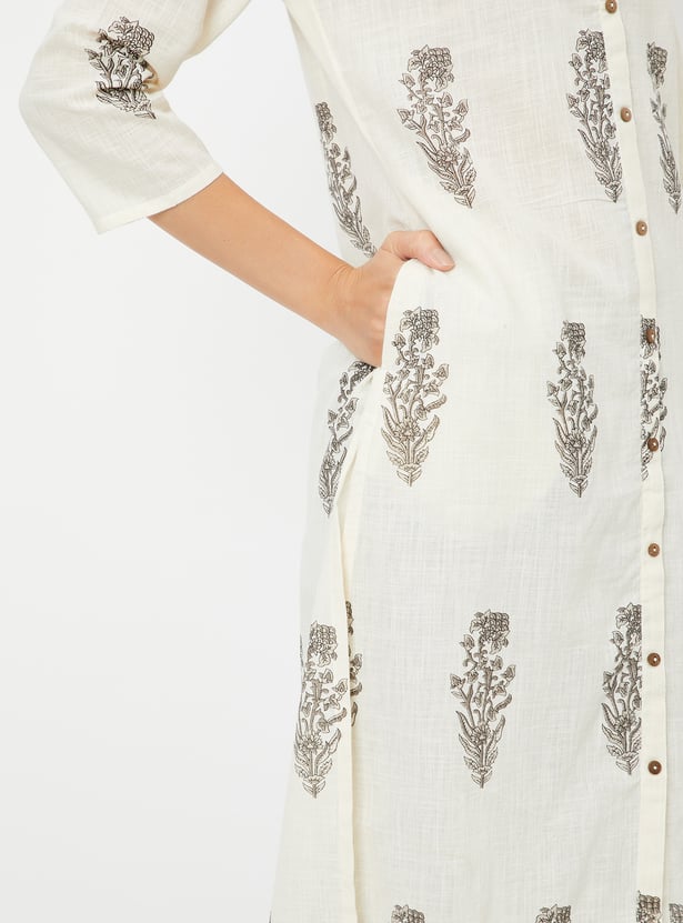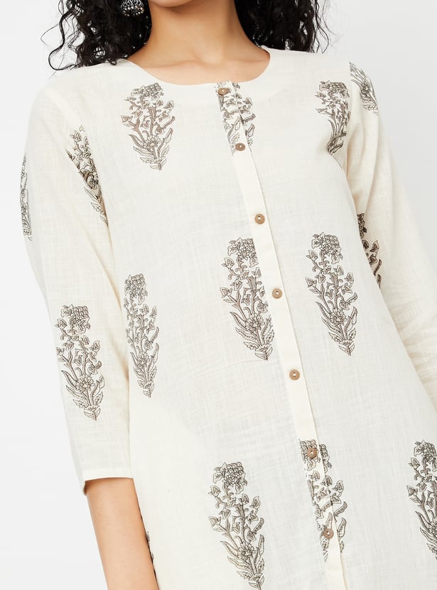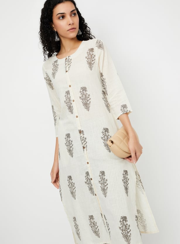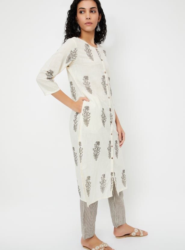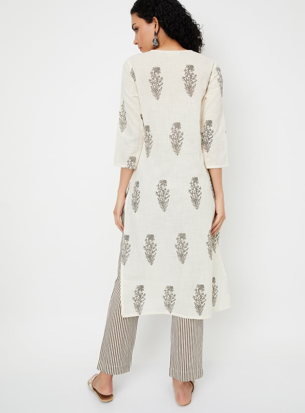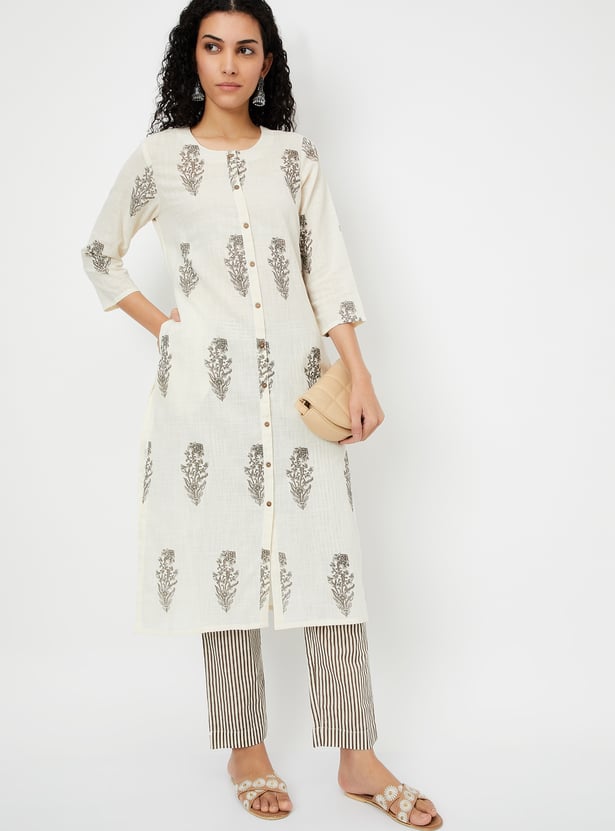 Adorn yourself in this beautiful kurta set, showcasing prints all over for a vibrant touch. The straight kurta features three-quarter sleeves, a round neckline, and a straight hemline, offering a chic yet comfortable look. Paired with striped straight pants designed with an elasticated waistband, this set ensures the utmost comfort for all-day wear