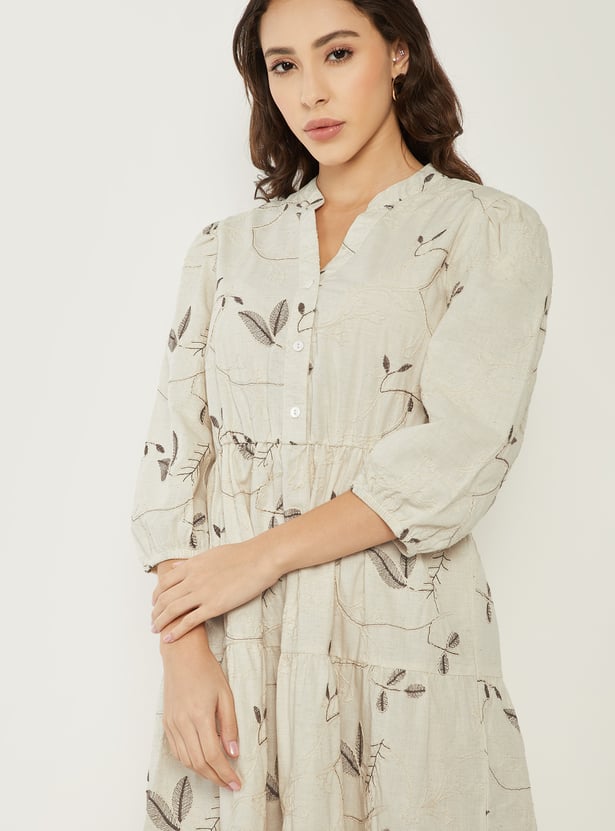 Add a graceful touch to your wardrobe with this printed tiered dress. Designed with a band collar, puff 3/4th sleeves, and a flowing midi length, it offers a charming silhouette with effortless elegance. Model Size :