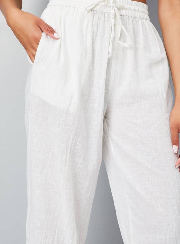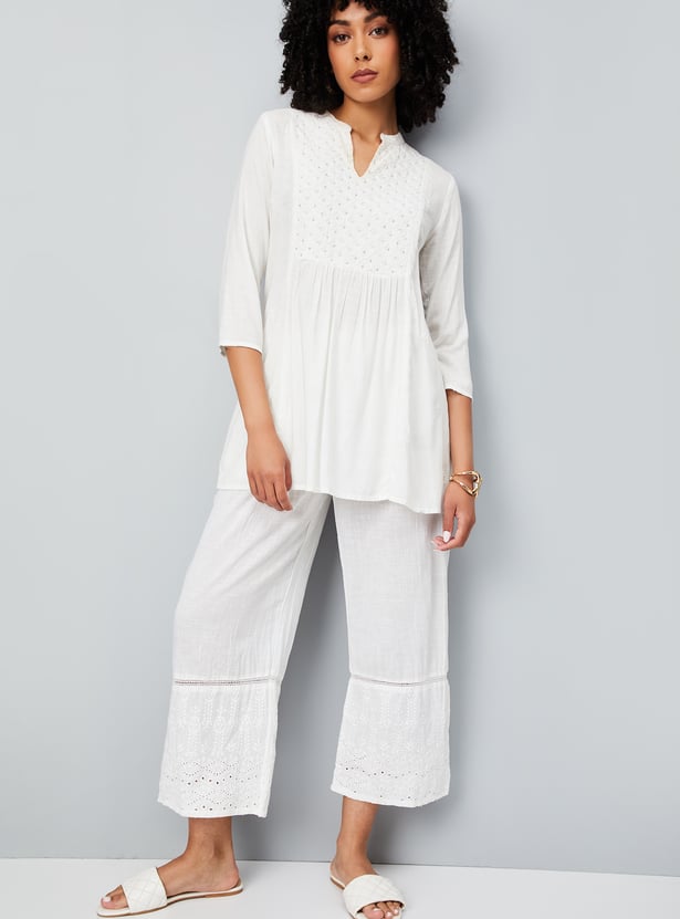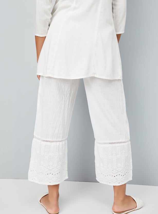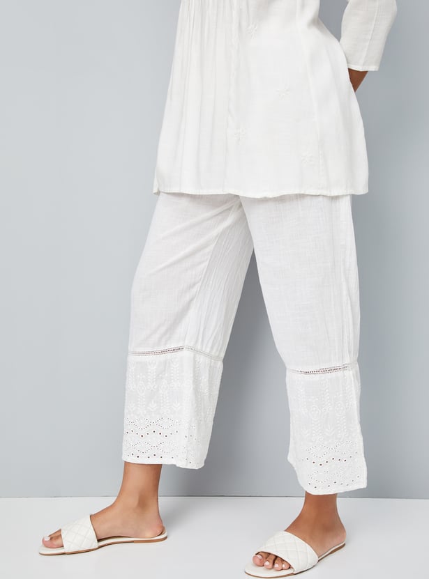 Breeze through your day in these Schiffli embroidered hem palazzos, where comfort meets delicate detailing. Designed with a drawstring closure and handy side pockets, they offer both ease and elegance in every step.