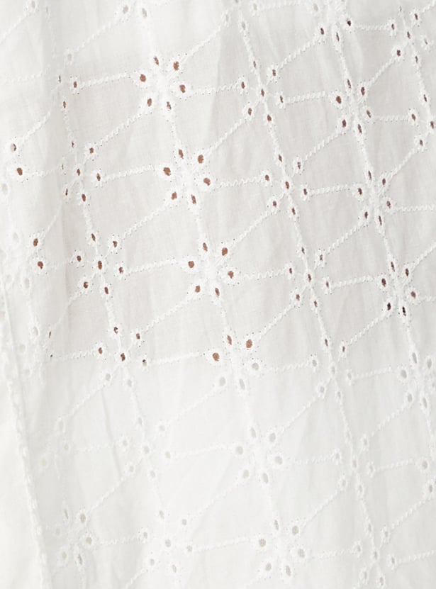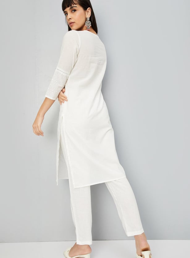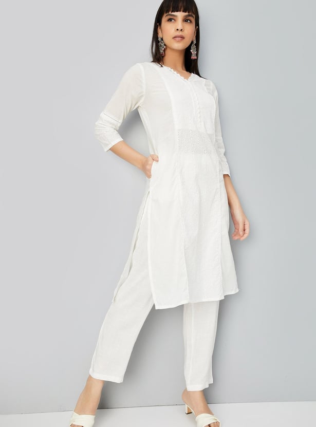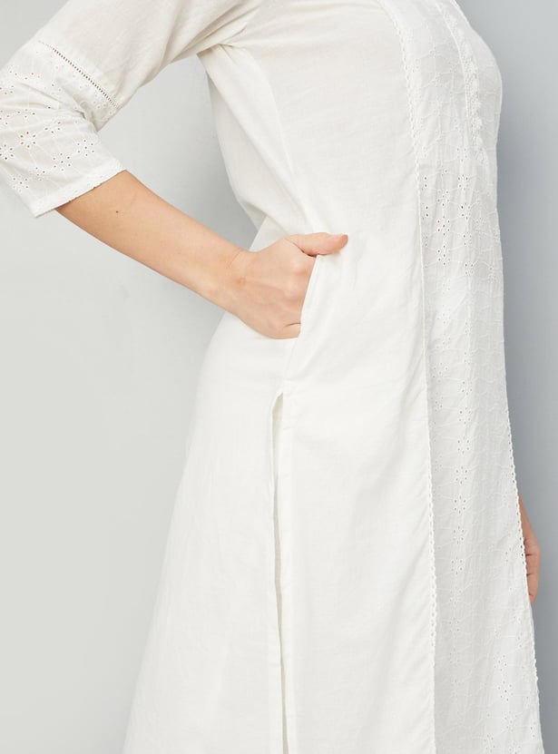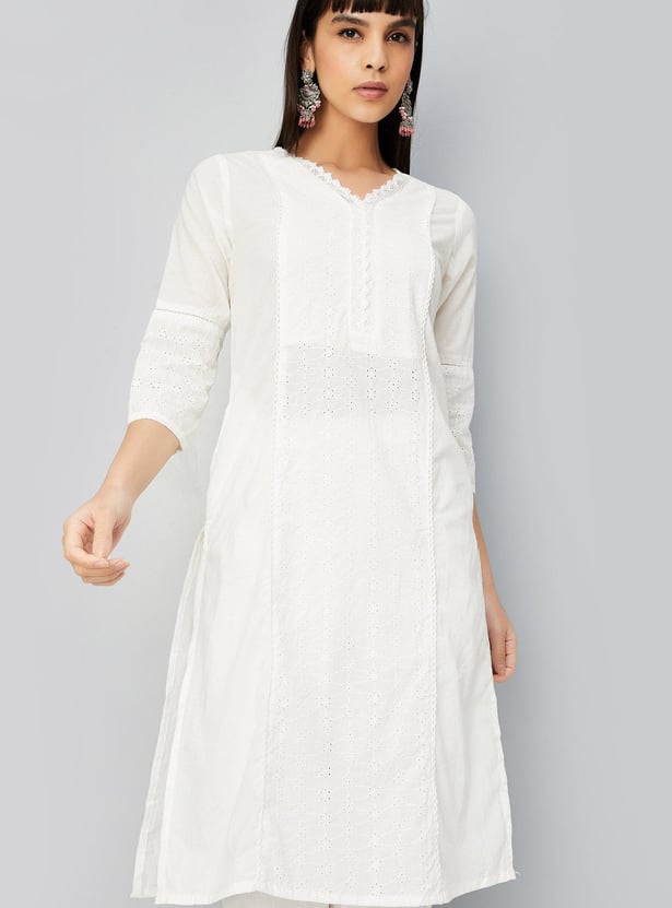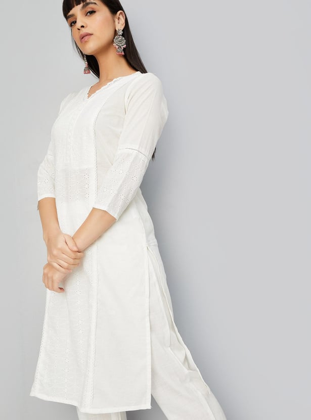 Glam up with this straight kurta with a schiffli design, a V-neck with lace, three-quarter sleeves, pockets and knee-length construction.
