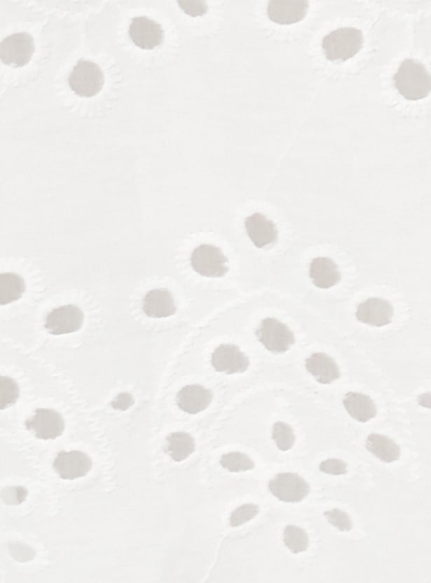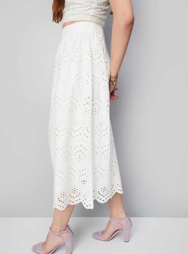 Flaunt your elegance in this A-line skirt. It is updated schiffli embroidery, an elasticated waist, and a scalloped hem. Pair this skirt with a matching crop top and block heels for a summer-ready look.