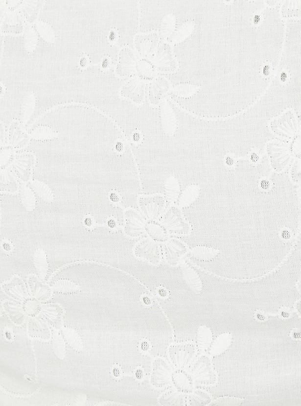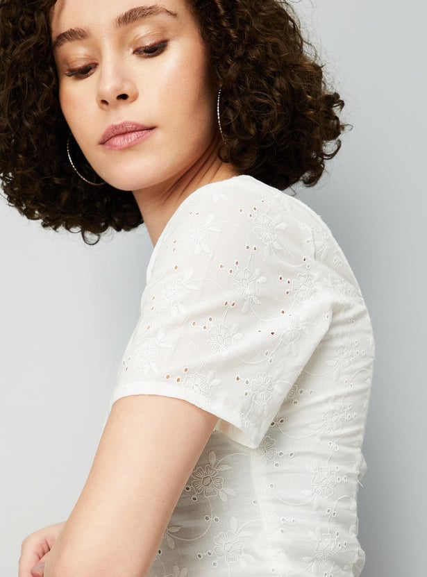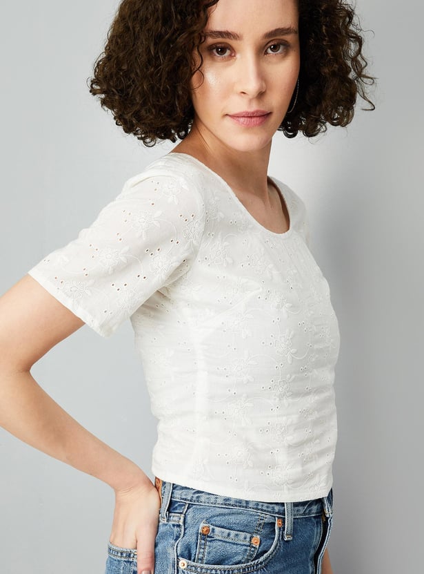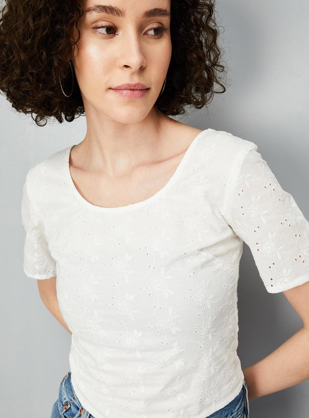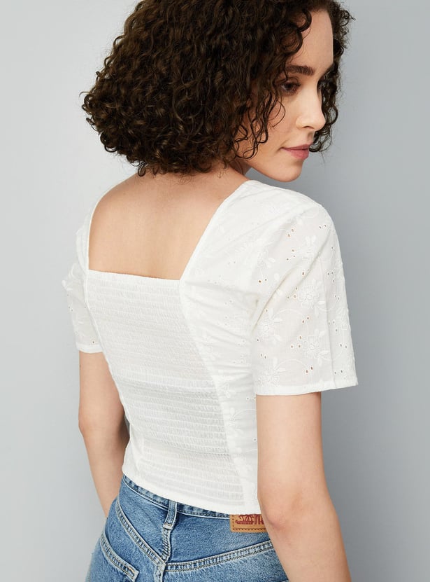 Refresh your style for the season with this top. The schiffli embroidery exudes effortless allure. Crafted in a short profile, this design has a round neckline, half sleeves, and a smocked back panel.