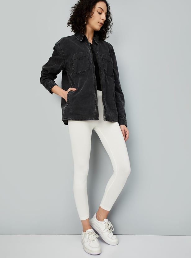 These solid calf-length leggings offer a comfortable fit with their elasticated waistband. Perfect for casual wear, they provide both style and flexibility for everyday activities.