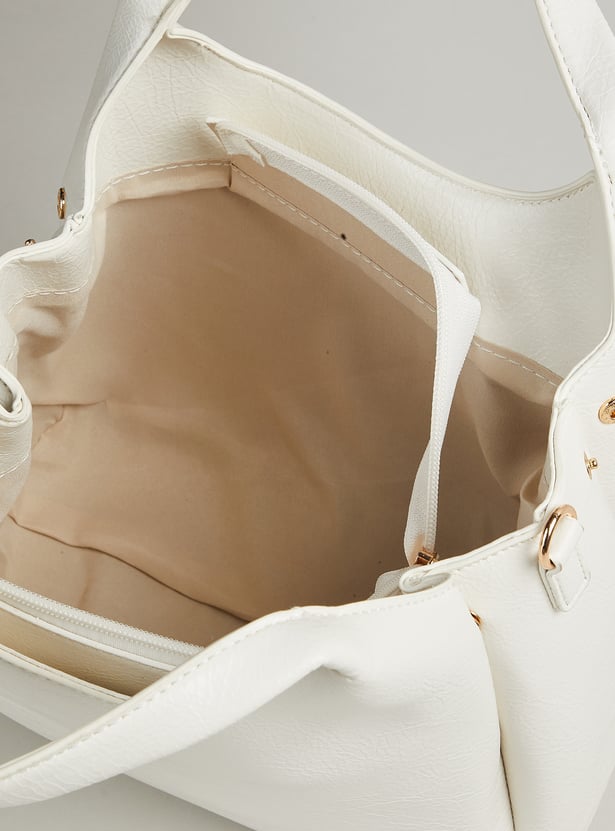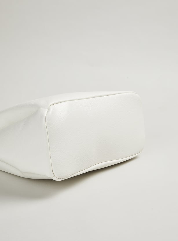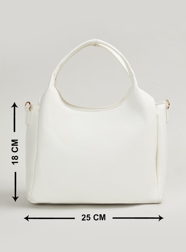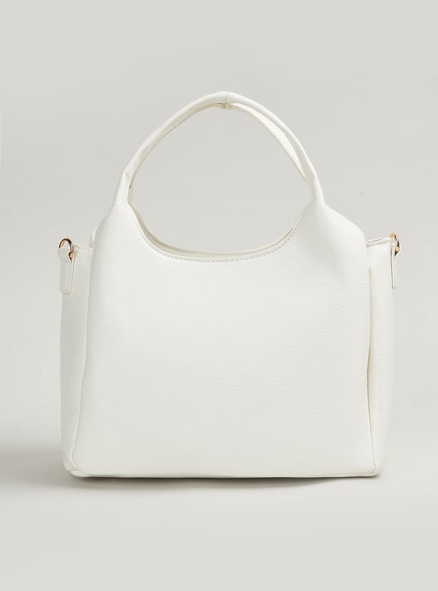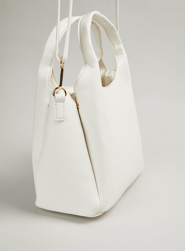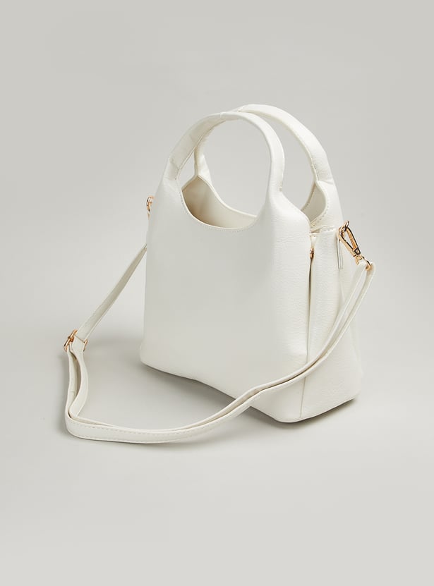 Solid handheld bag, designed with a spacious zip compartment, dual handles, inner pockets, and a sling strap.