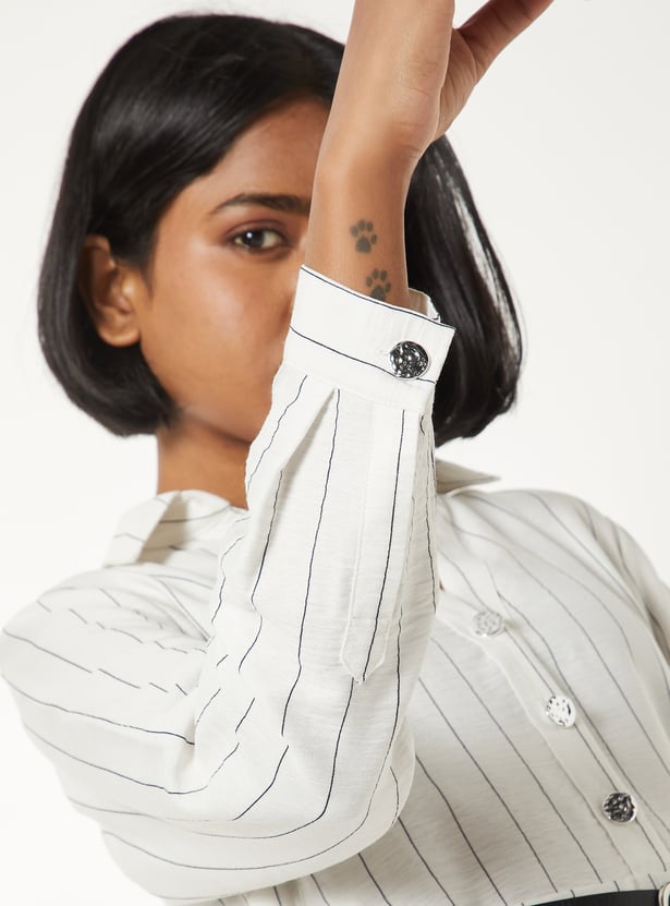 A chic printed shirt dress featuring a belted waist, full sleeves with cuffed button details, and a structured button-down yoke for a polished silhouette. Subtle stripes and a collared neckline add a modern touch.