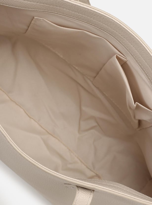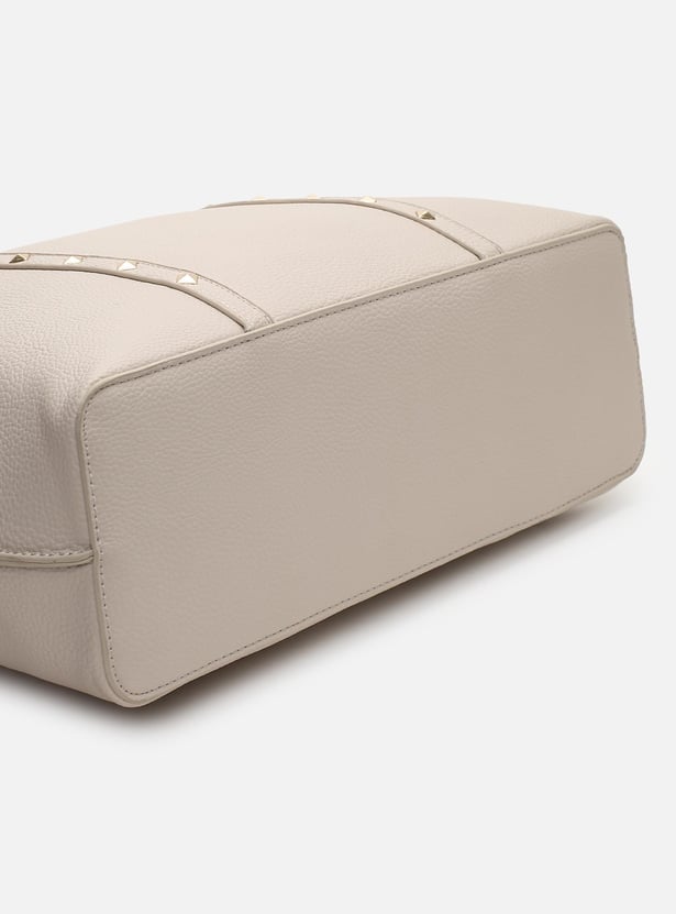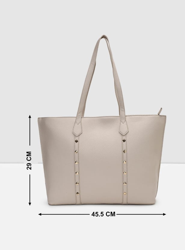 Carry everything in style in this tote bag highlighted with pyramid studs. It features a textured exterior, flat straps, and a spacious main zip compartment with convenient interior pockets.