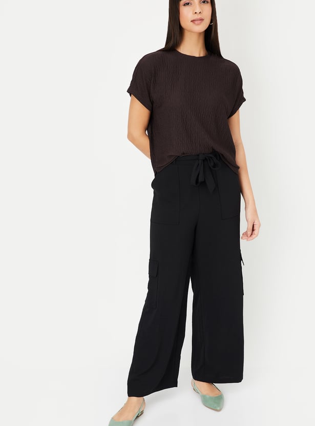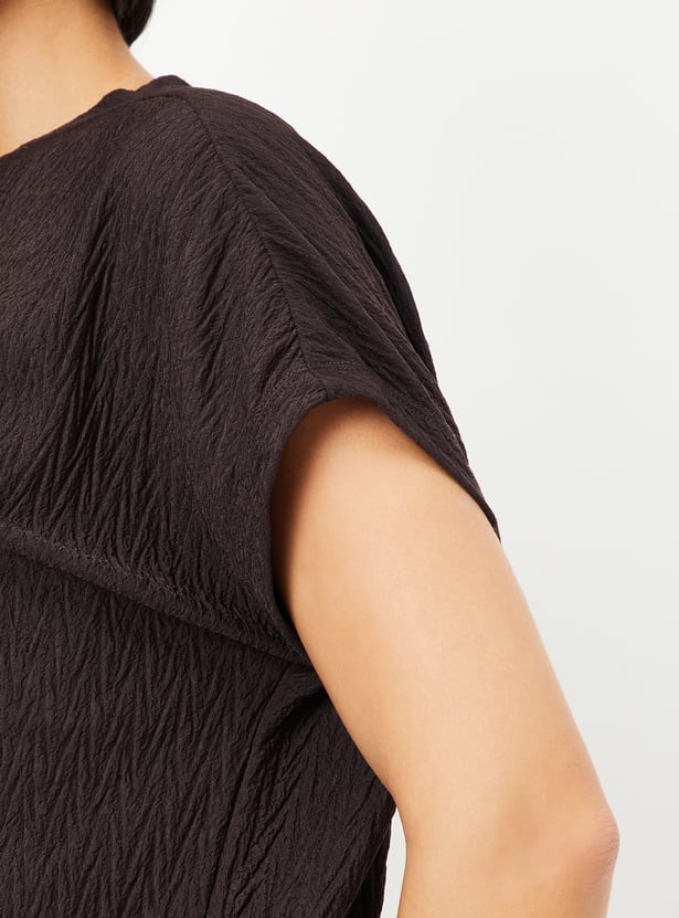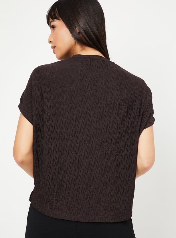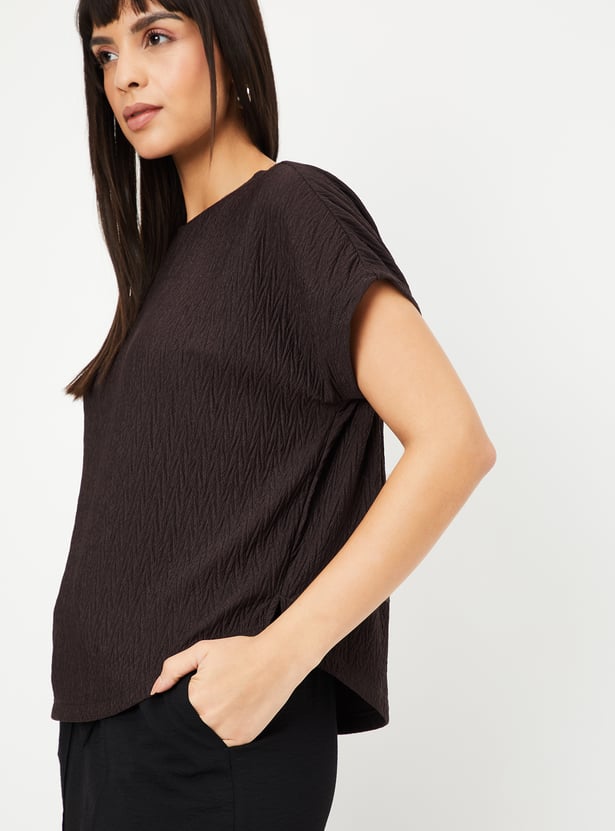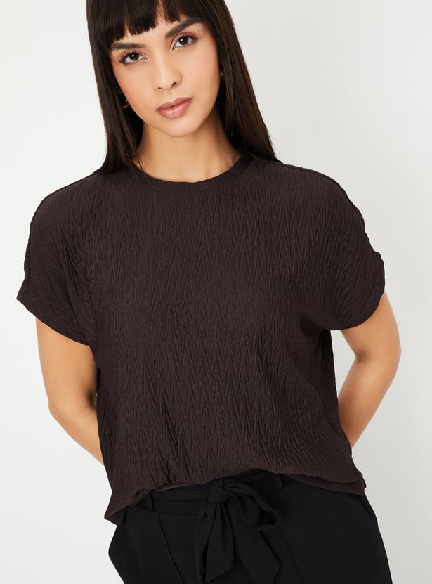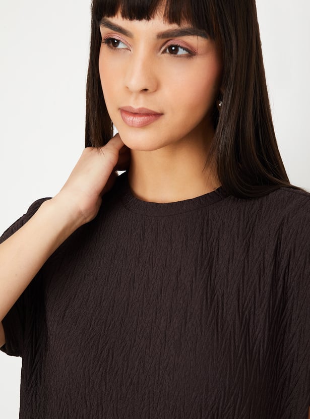This textured top adds a refined touch to your everyday style. Featuring a classic round neck and extended sleeves, it offers a feminine silhouette with subtle detailing—perfect for casual outings or dressy occasions. Model Size :