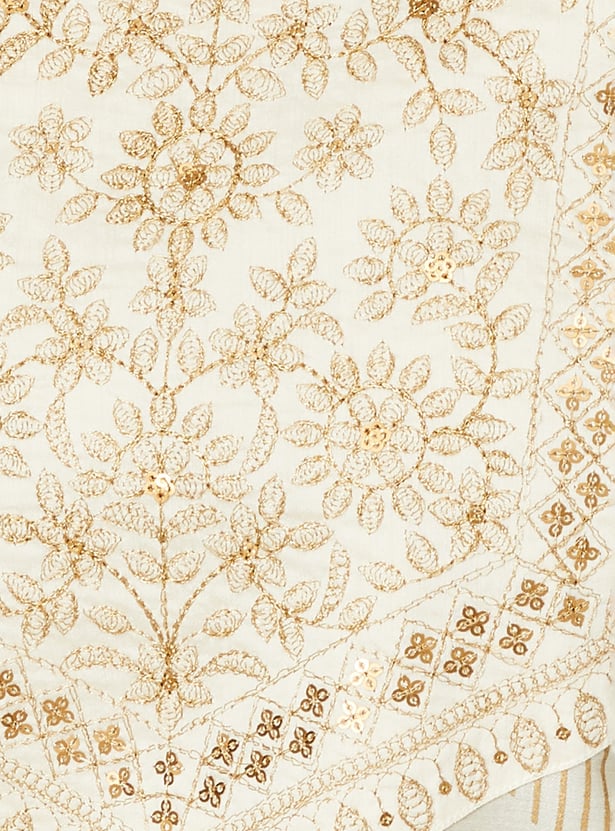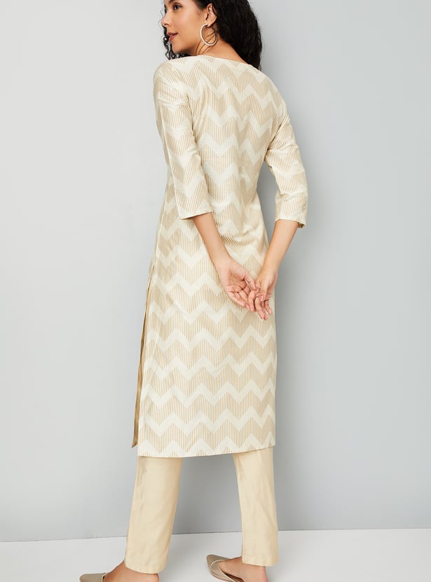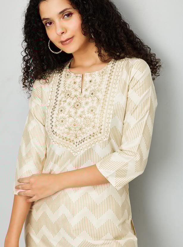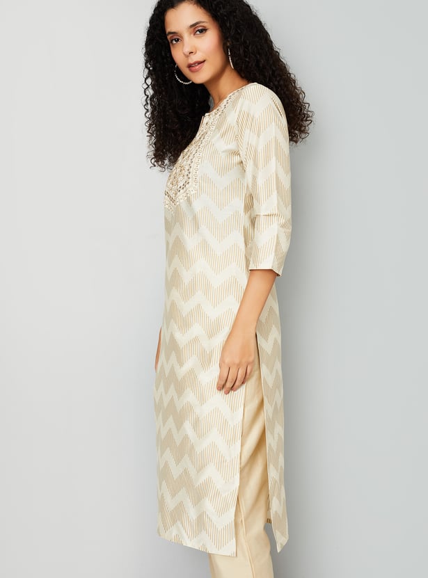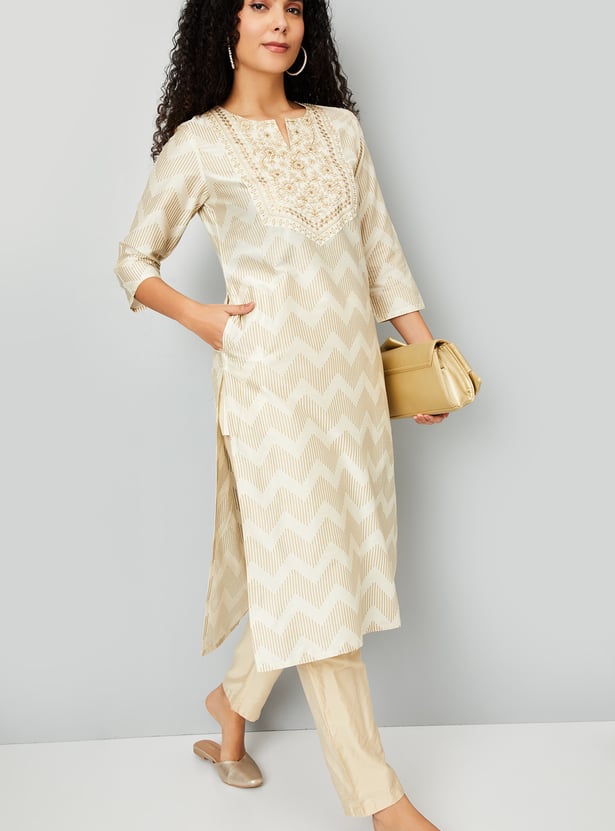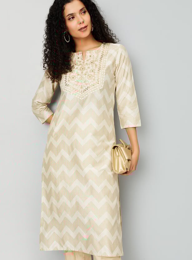 Traditional charm meets everyday comfort in this straight kurta featuring intricate yoke embroidery over a chic chevron print. Designed with a notch neck, 3/4th sleeves, practical side pocket, and side slits for ease of movement.