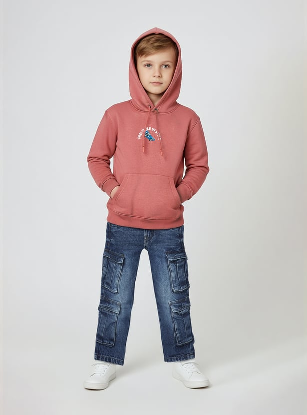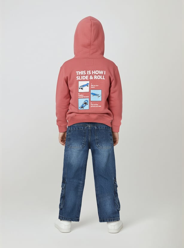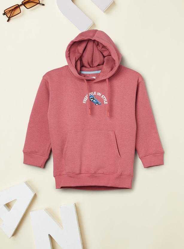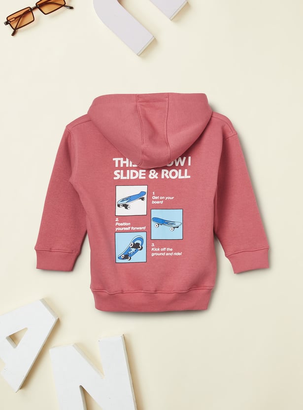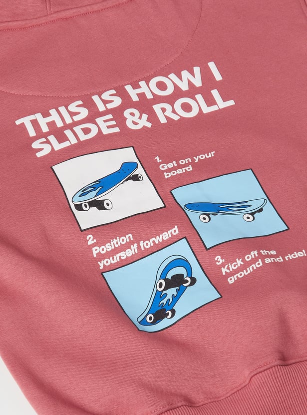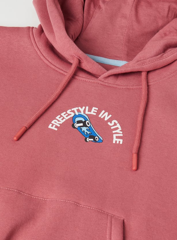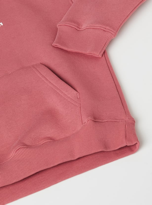 Stay cozy in this printed hooded oversized sweatshirt, featuring full sleeves, a ribbed hem, and a handy kangaroo pocket.