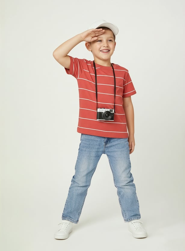 This striped T-shirt features a classic crew neck and half sleeves, offering a comfortable and casual fit for your child. Perfect for everyday wear, it effortlessly combines style and comfort.