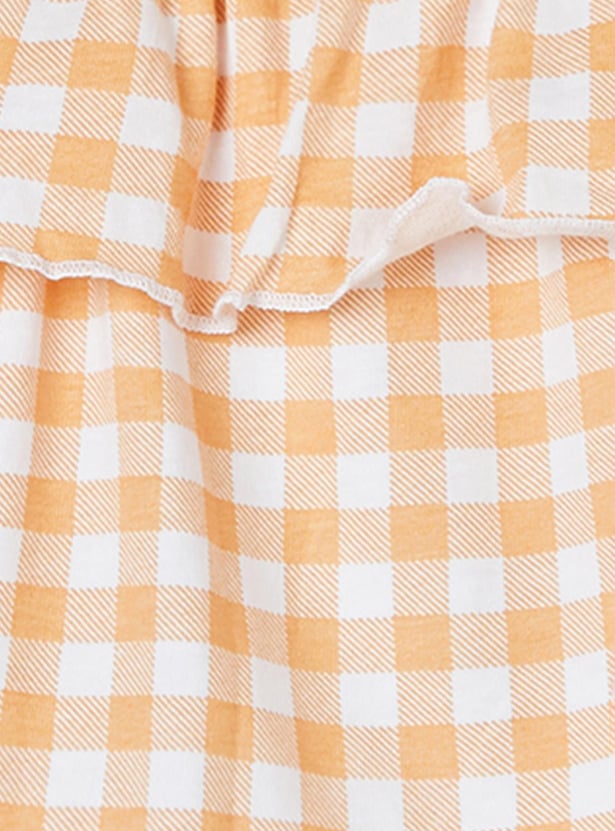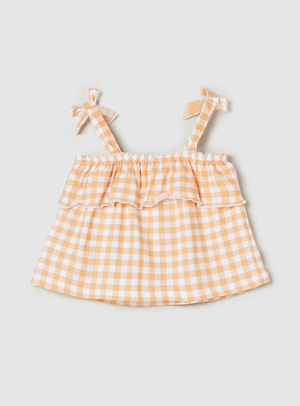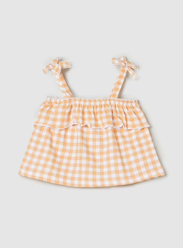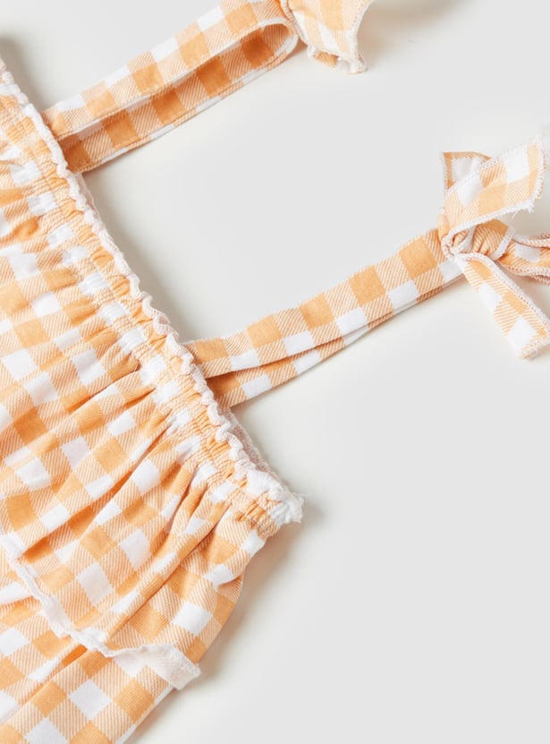 Summer calls for this classic checked top. It is styled with shoulder straps with tie-ups, a square neck, a curved hem, and an A-line profile.