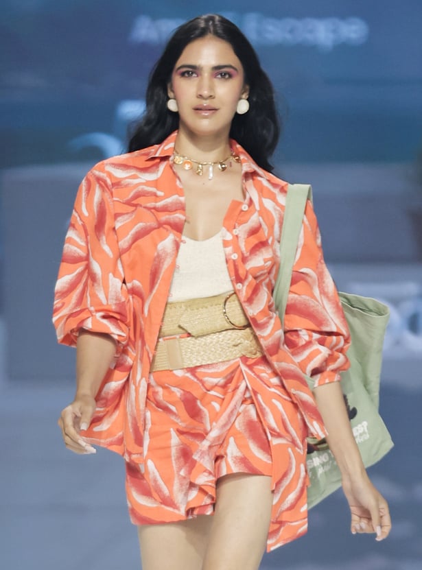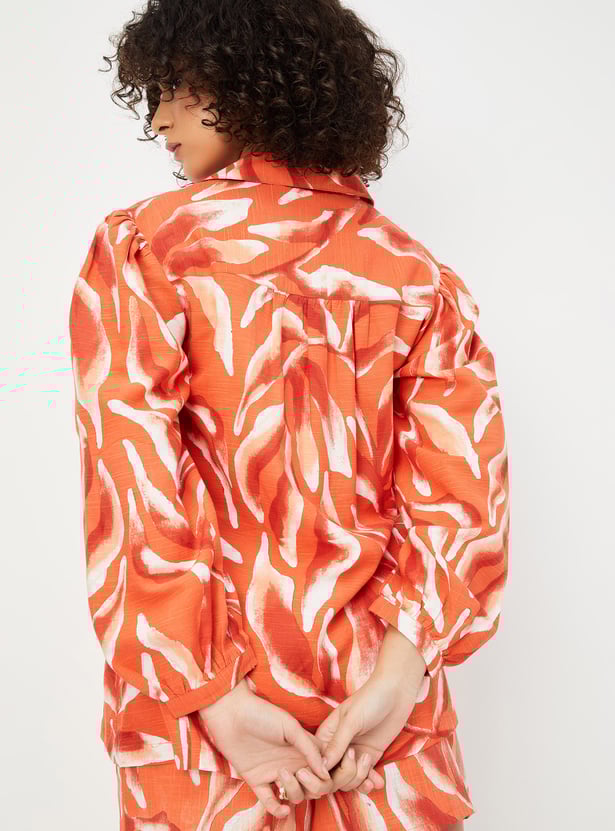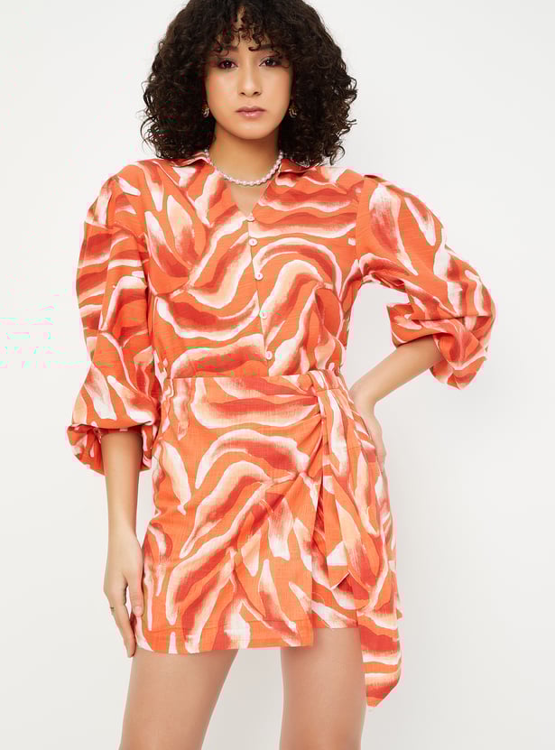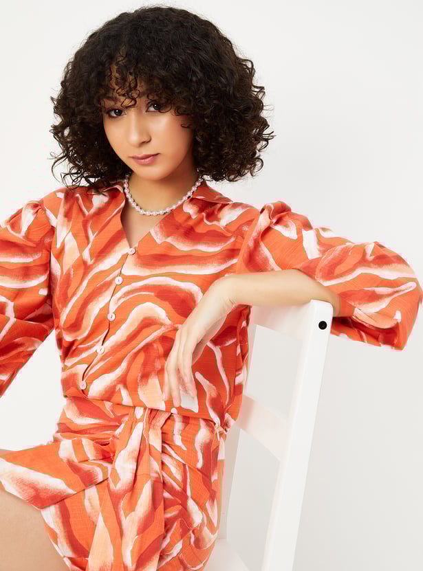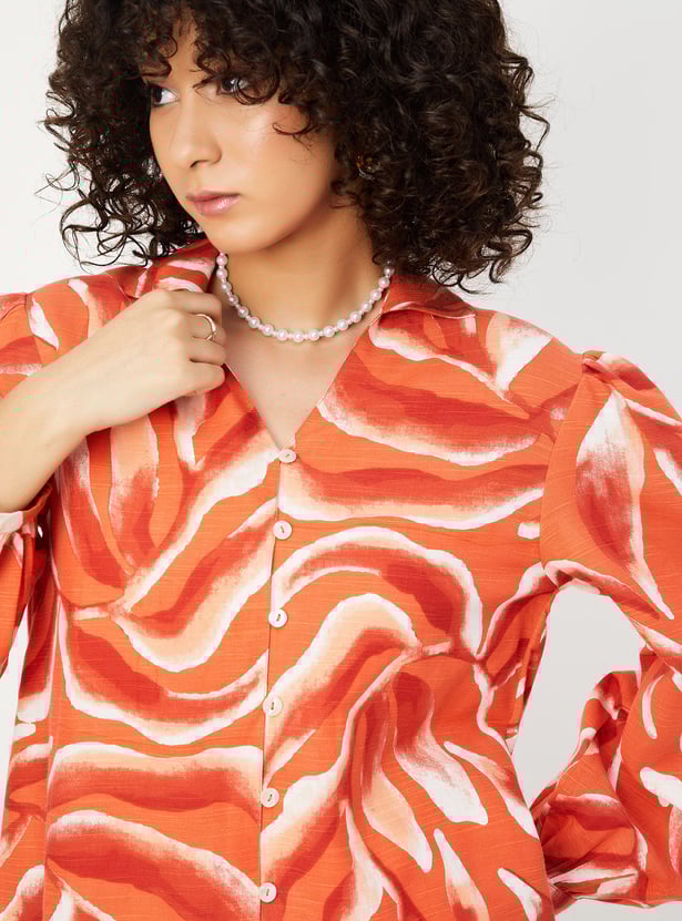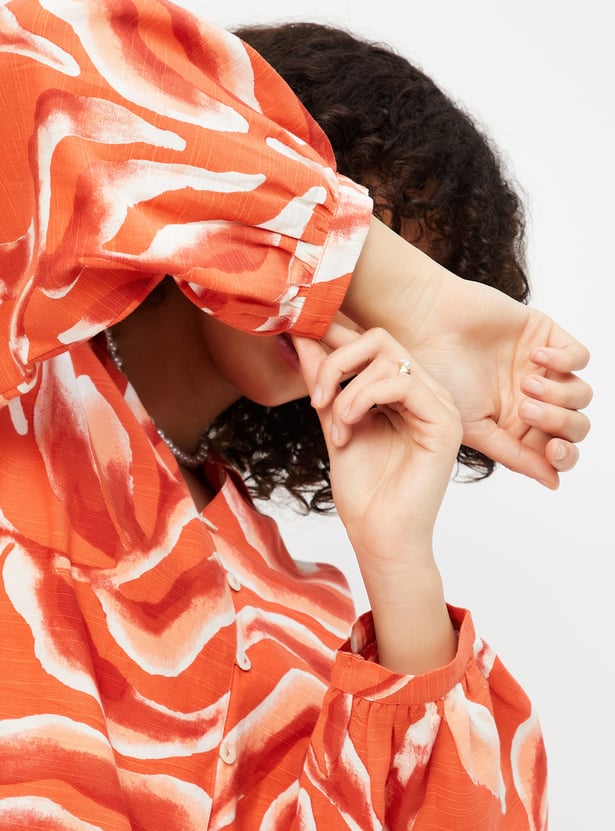 Look vibrant this season with this tunic. The abstract prints add to the visual appeal. It features a collared neck, bishop sleeves, and a front button placket.