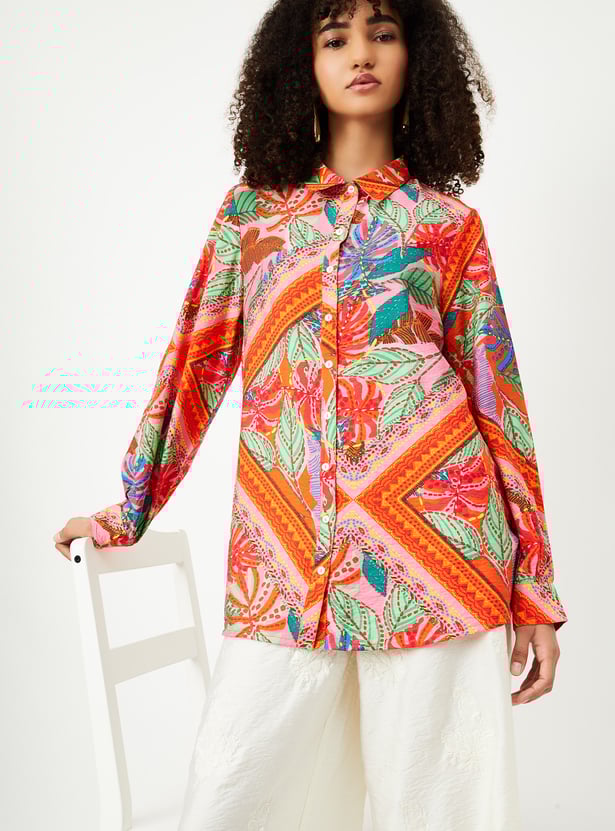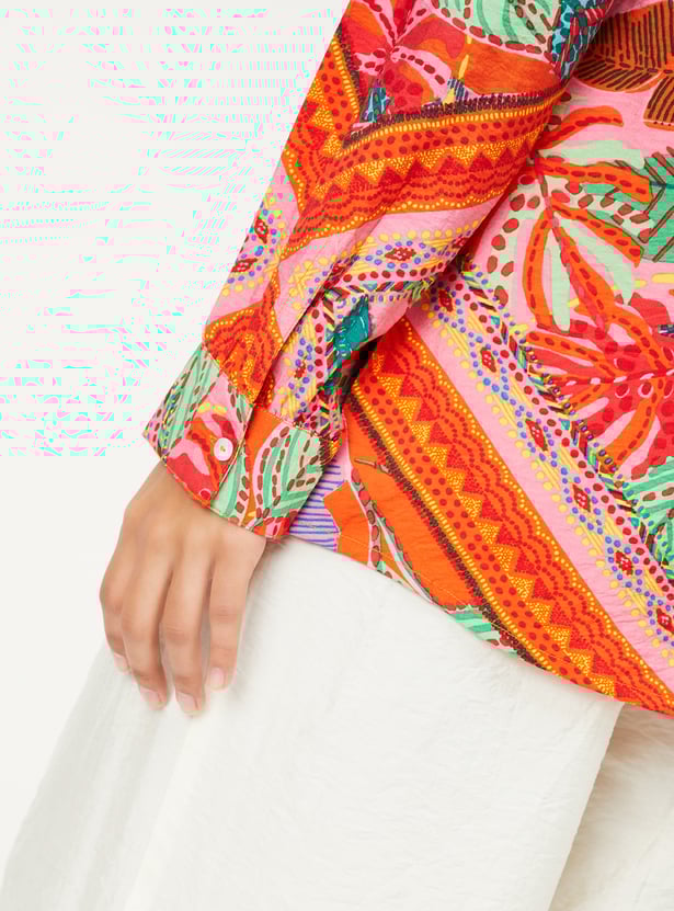 Elevate your casual style with this women’s printed tunic, featuring a spread collar and a button placket for a classic yet chic look. The full sleeves with button cuffs add a sophisticated touch, making it perfect for any occasion.