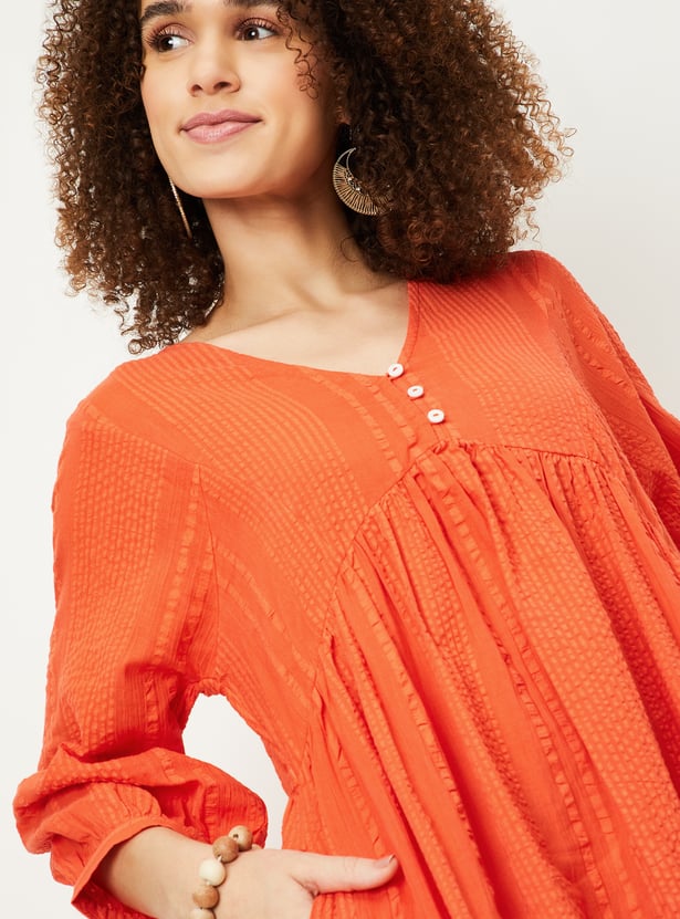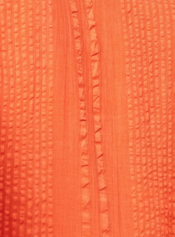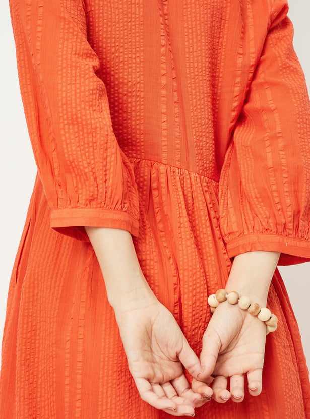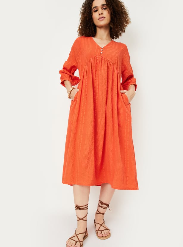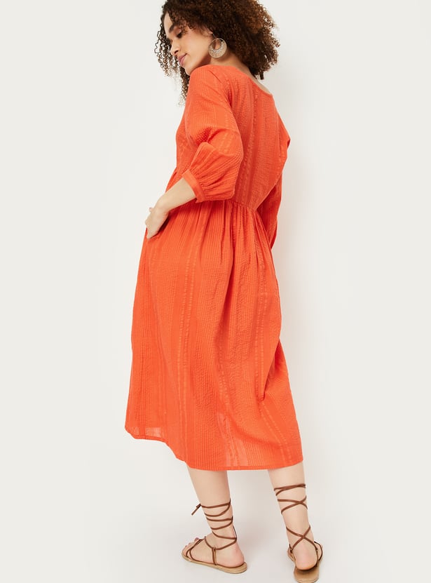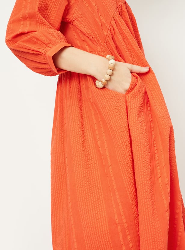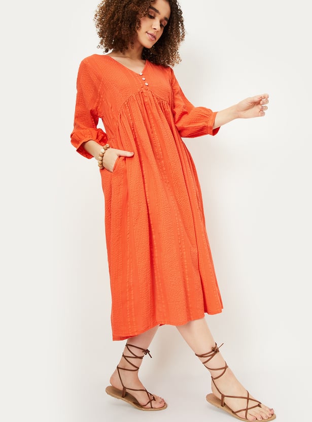 Step into effortless elegance with this A-line dress! Designed with a flattering V-neck and three-quarter sleeves, this dress combines style and practicality with the added convenience of side pockets. The textured seersucker fabric enhances its charm, making it perfect for both everyday wear and special occasions.