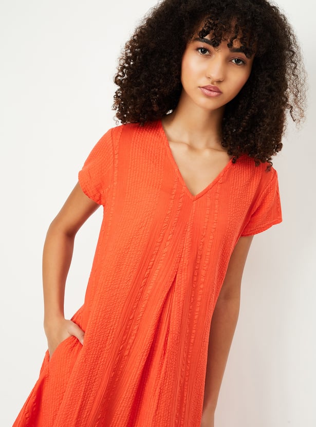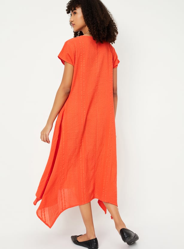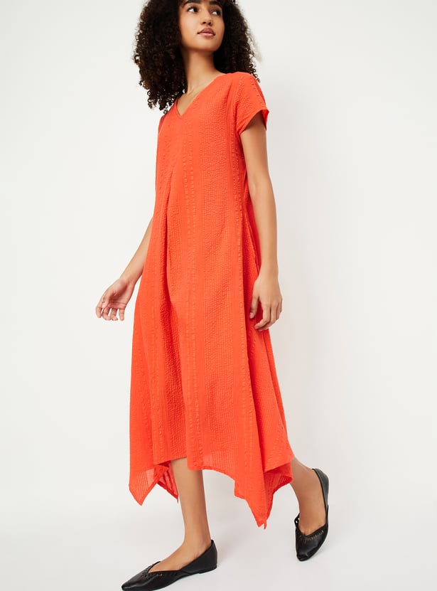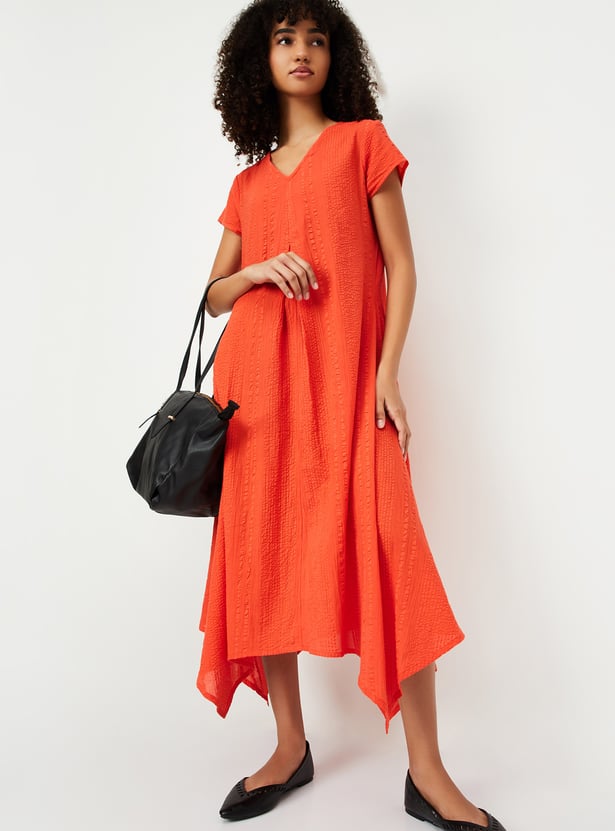 Step into a fresh look with this A-line dress, featuring a flattering v-neck, side pocket, half sleeves, and a trendy asymmetric hem. The textured pattern bring a pop of style, while the comfortable fit ensures you'll be turning heads all day.