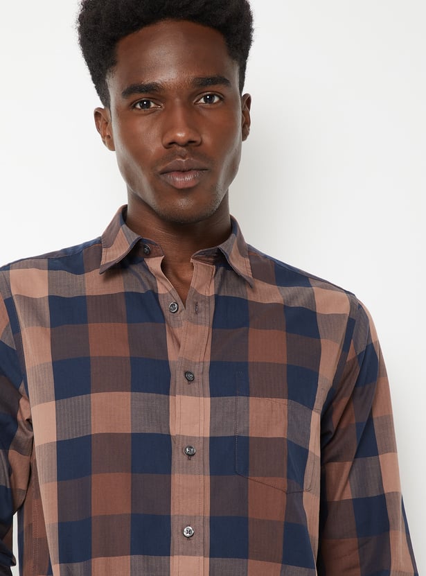 This checked slim fit shirt combines classic style with modern tailoring, featuring a spread collar, button placket, patch pocket, and full sleeves with button cuffs. Its slim silhouette offers a sharp and polished look.