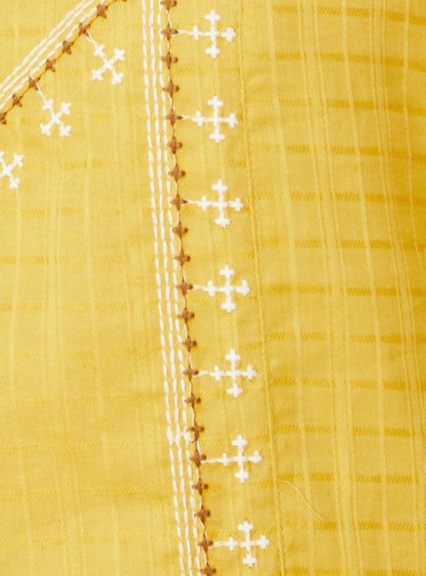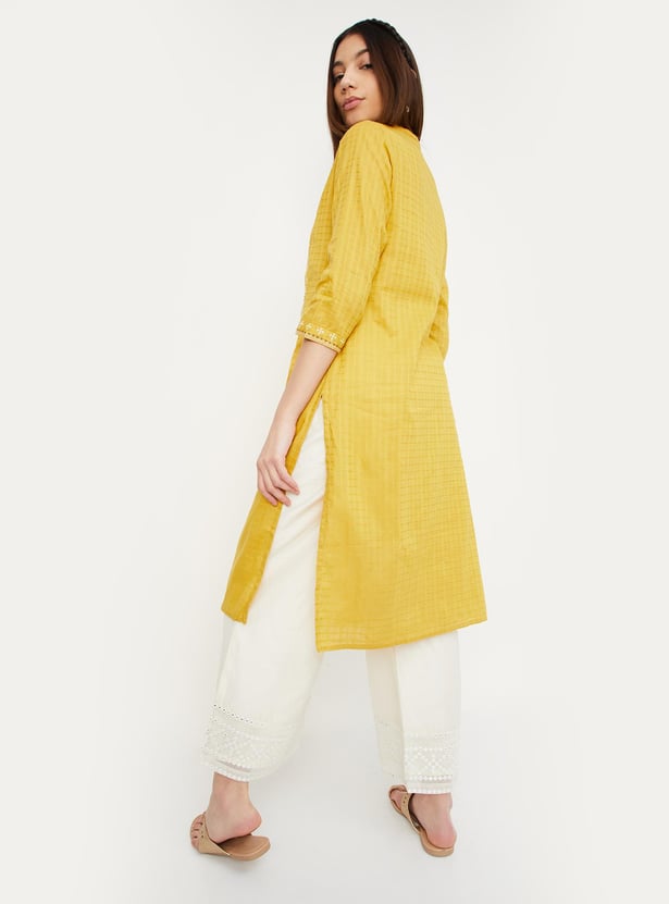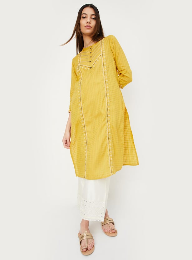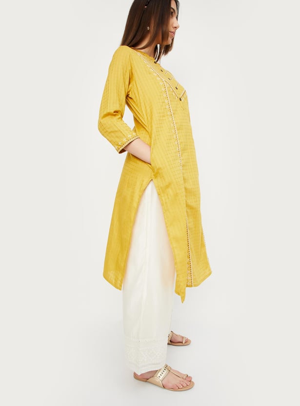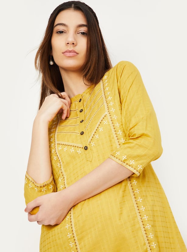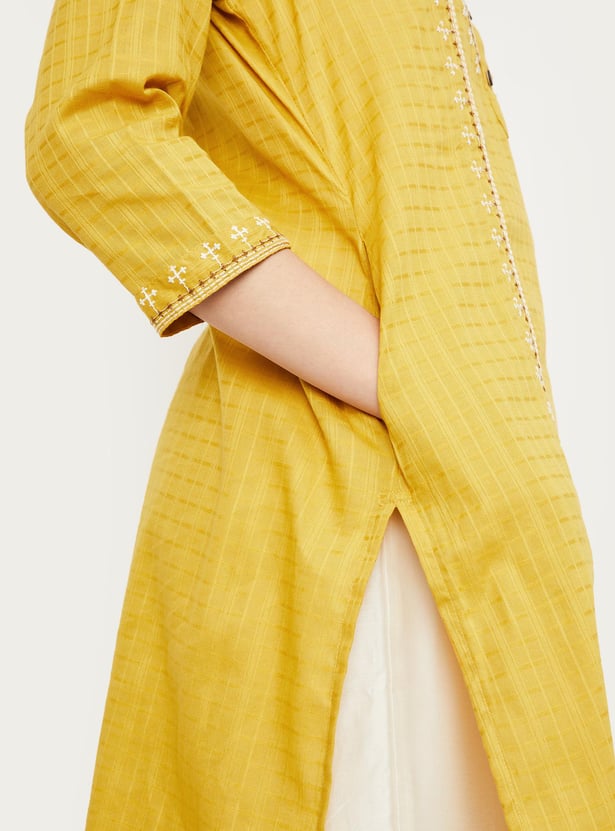 Create an effortless look with this straight kurta. It has three-quarter sleeves, pockets, a band collar with an embroidery design on the front and a button placket.