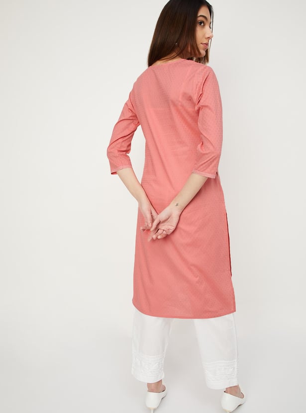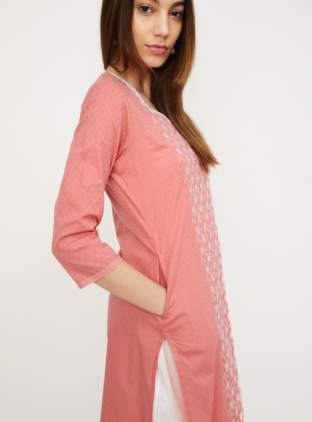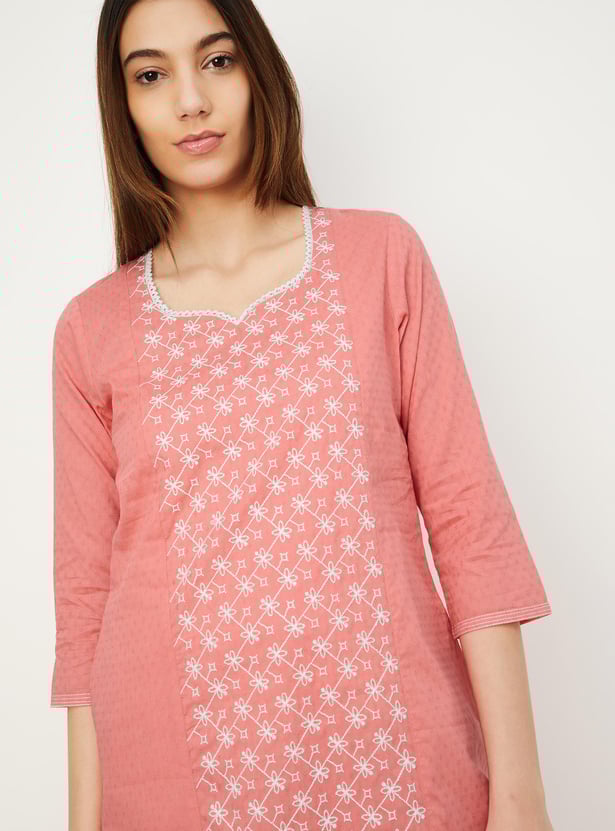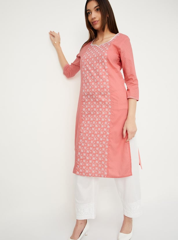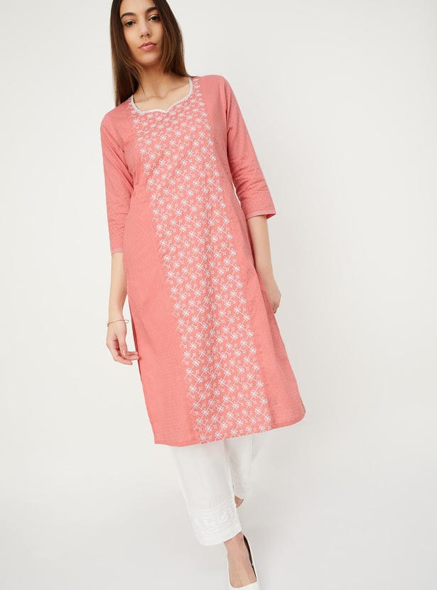 Create an effortless look with this straight kurta. It has three-quarter sleeves, pockets, a V-neck with an embroidery design on the front and a pocket.