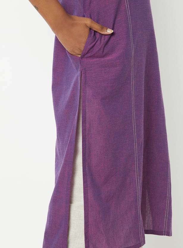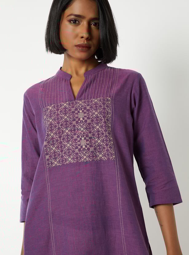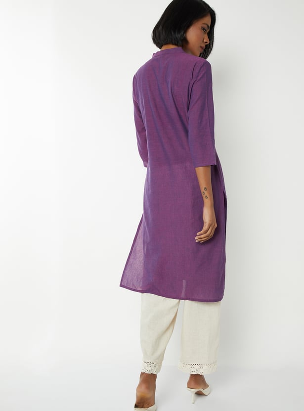 This embroidered straight kurta combines traditional charm with modern style. Featuring a band collar, 3/4th sleeves, a button placket, side slits, and a convenient side pocket, it’s designed for comfort and elegance.