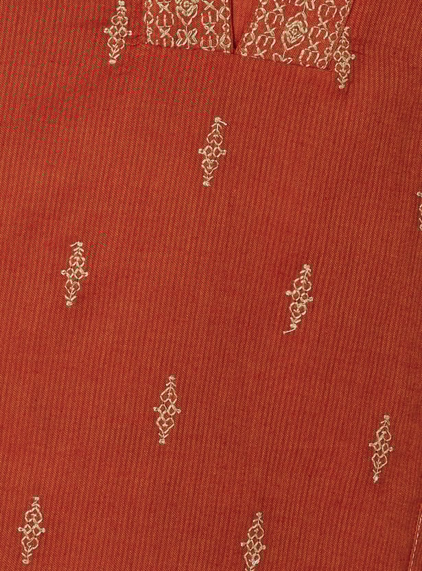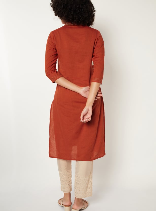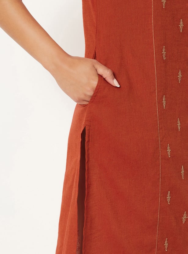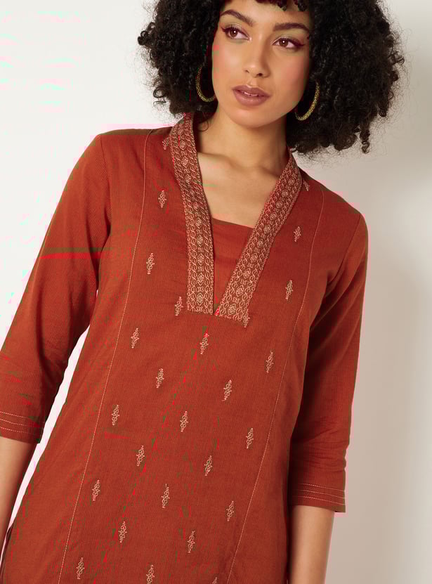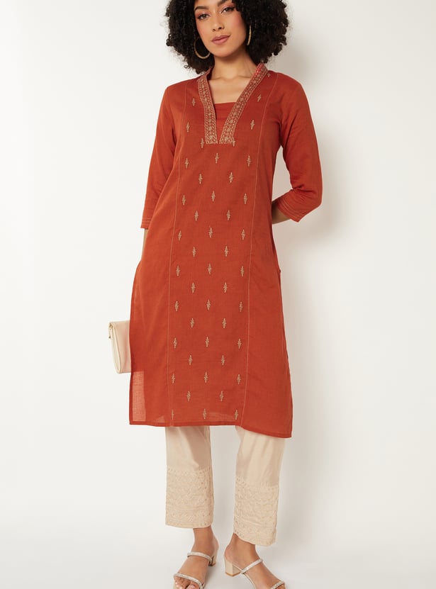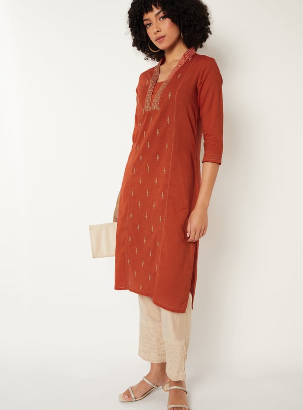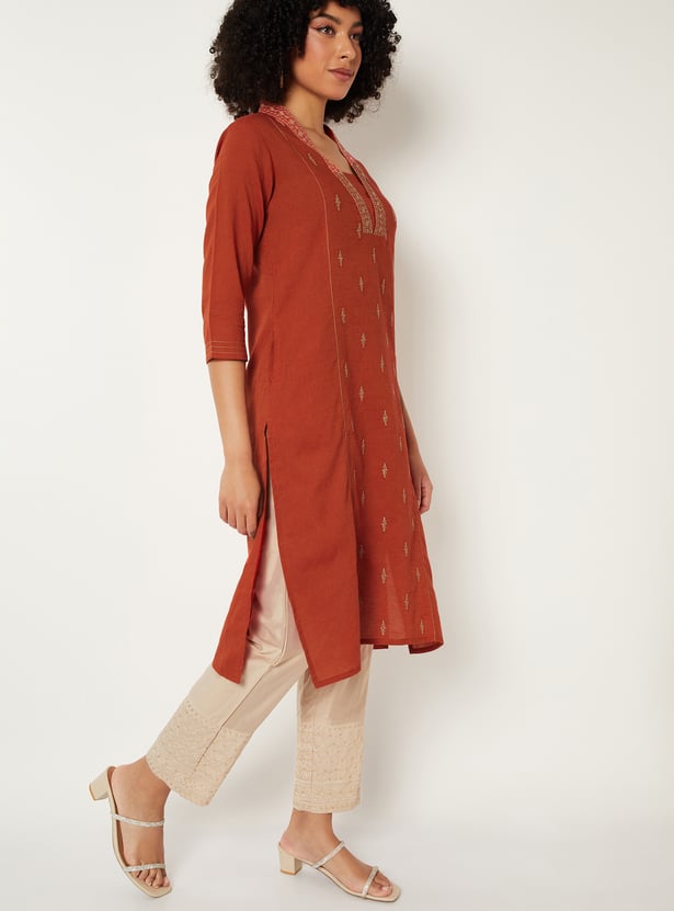 Add timeless elegance to your collection with this embroidered straight kurta, featuring a flattering V-neck, handy side pockets, 3/4th sleeves, and side slits for comfort and style. Perfect for both casual and festive occasions.