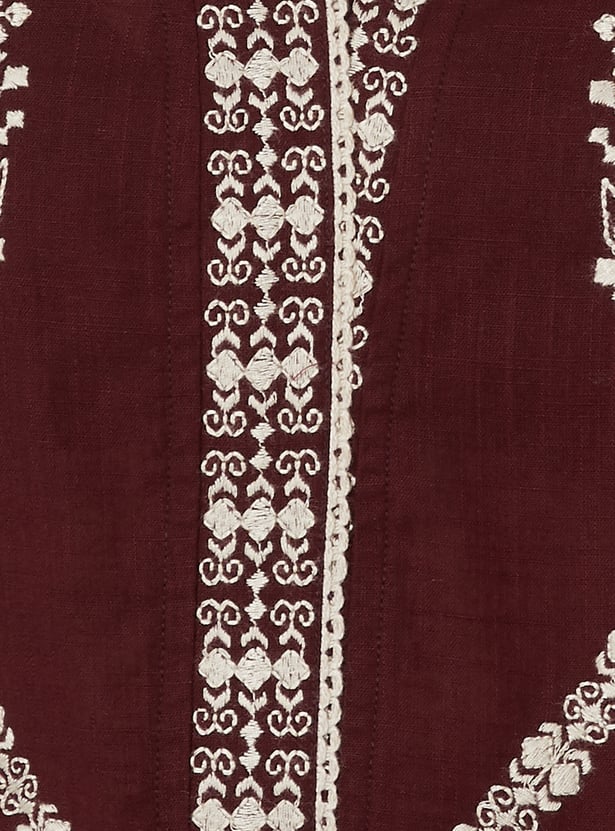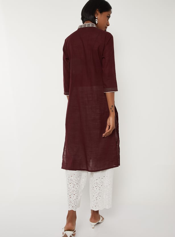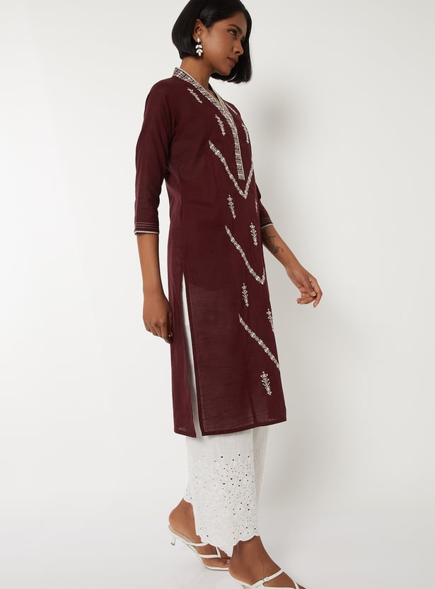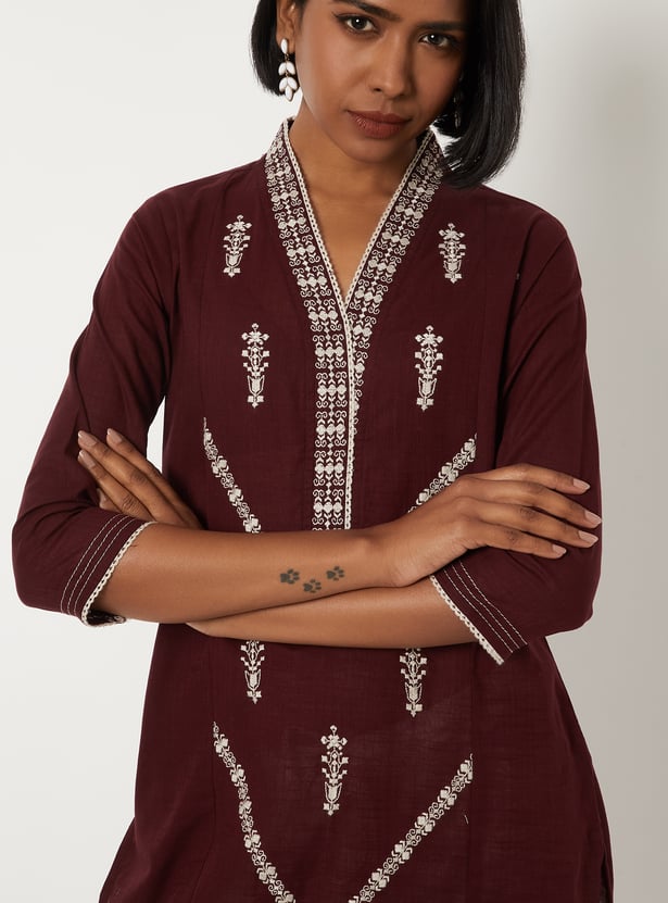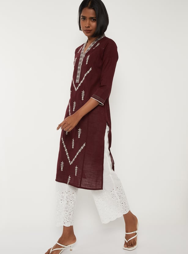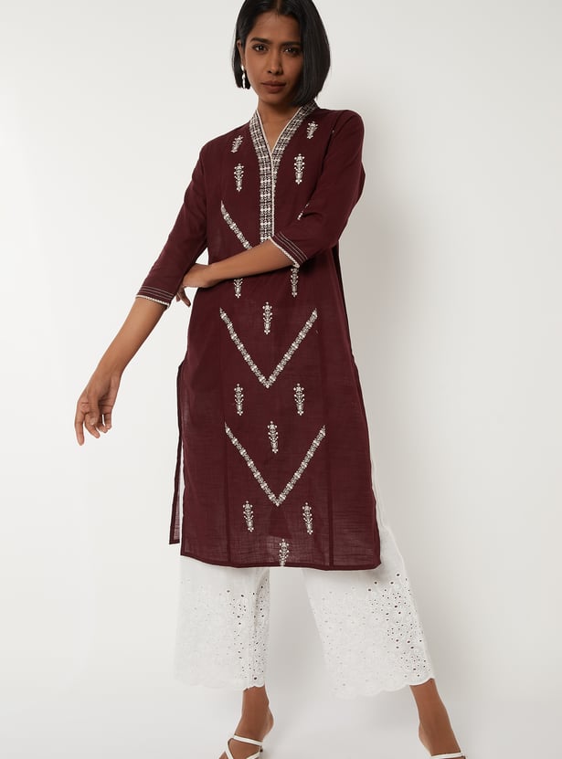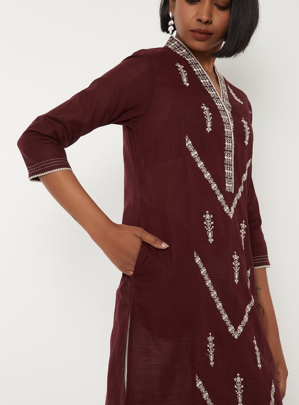 Paint a picture of elegance in this straight kurta. The embroidered detailing adds a sophisticated touch, while the waist pocket offers convenience. It features a V-neck and three-quarter sleeves with lace trim.