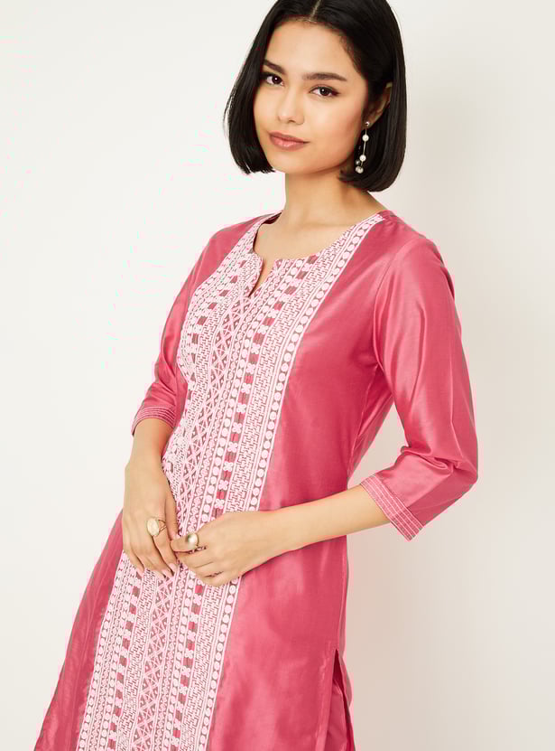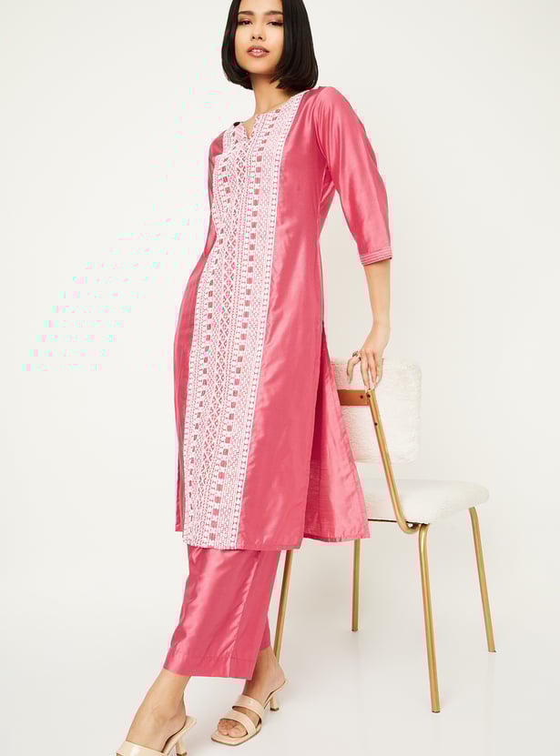 This embroidered kurta set combines elegance and comfort, featuring a straight kurta with a notched neck, 3/4th sleeves, and side slits. It is paired with solid, elasticated waist straight pants, adding a modern contrast to the traditional design.