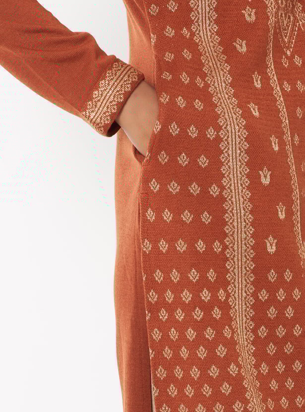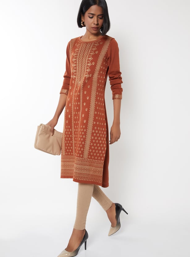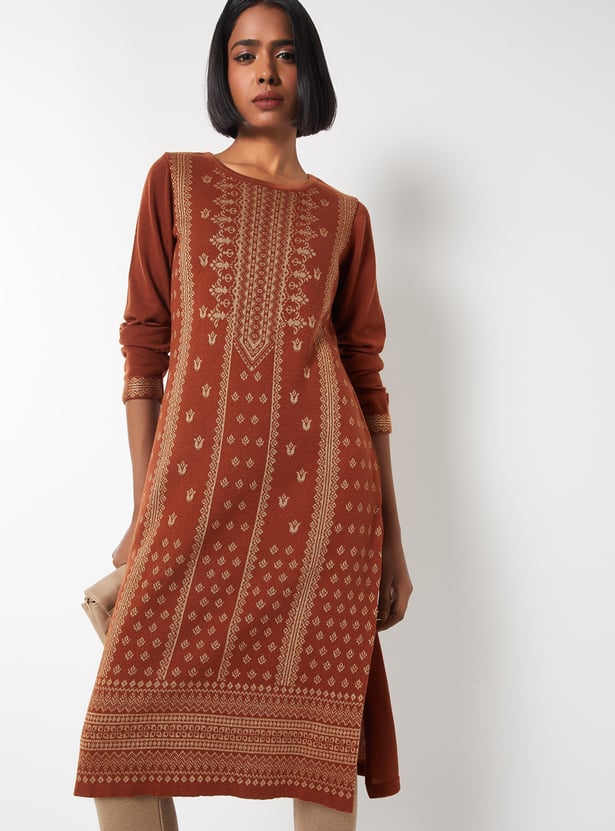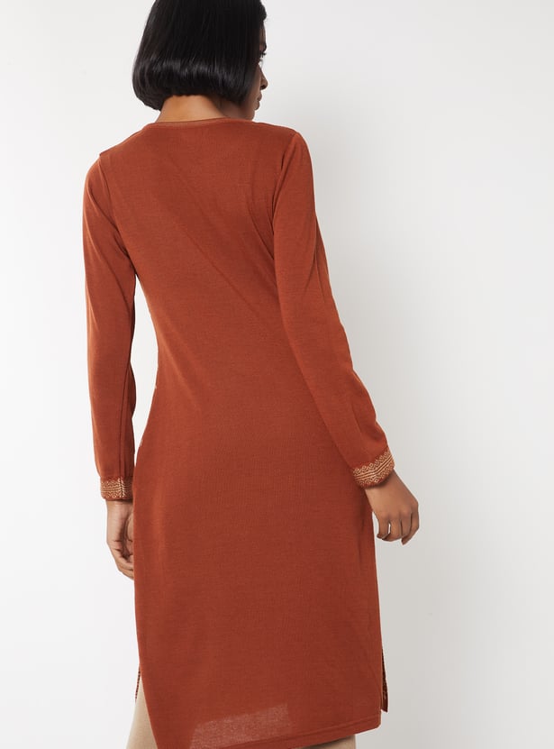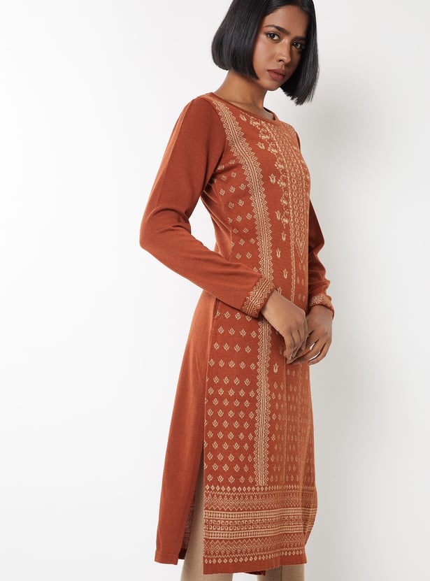 Stay warm in style with this knit straight winter kurta, designed for cozy comfort and effortless elegance. It features a round neck, full sleeves, side slits, and a practical side pocket—perfect for chilly days.